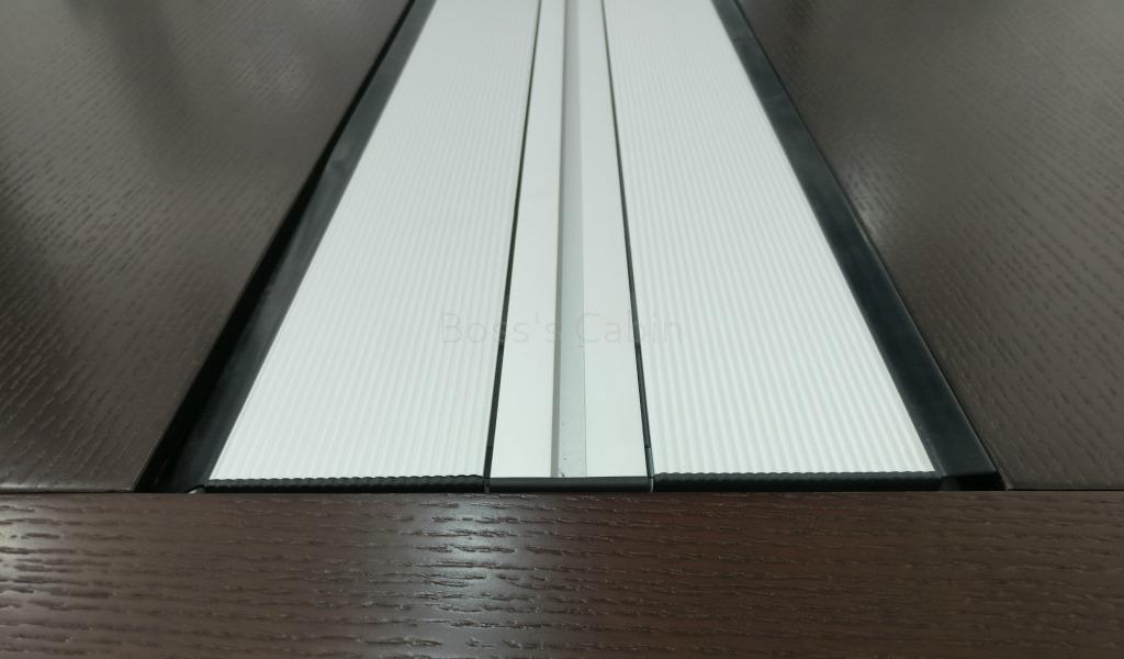 Conference table with a flip-open wire management tray on table top that runs in the center and two wire boxes.