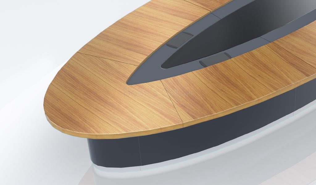 1. Veneer clad oval shape top. 2. Charcoal gray lacquered base. F 3. Four wireboxes with internet, power and telephone sockets.