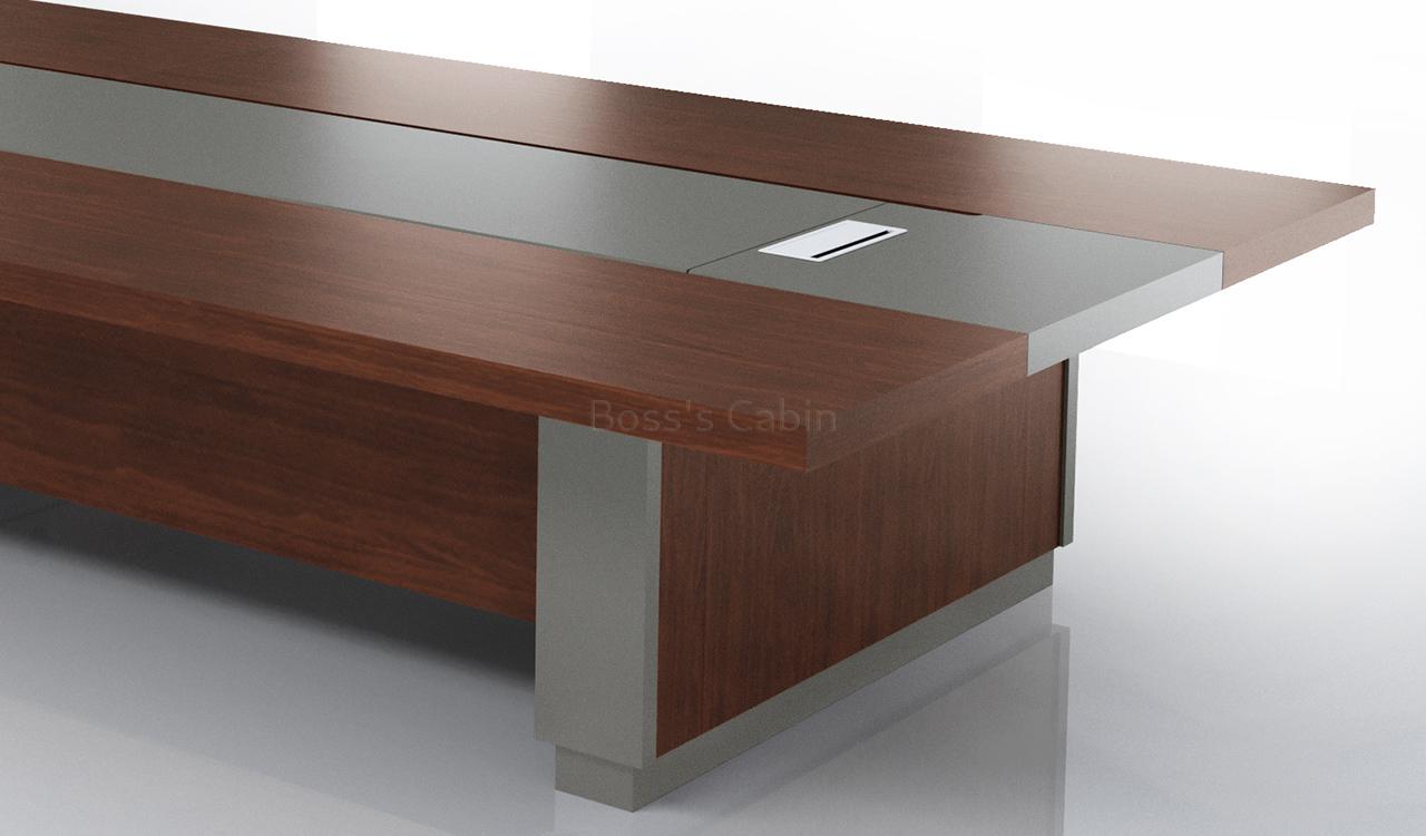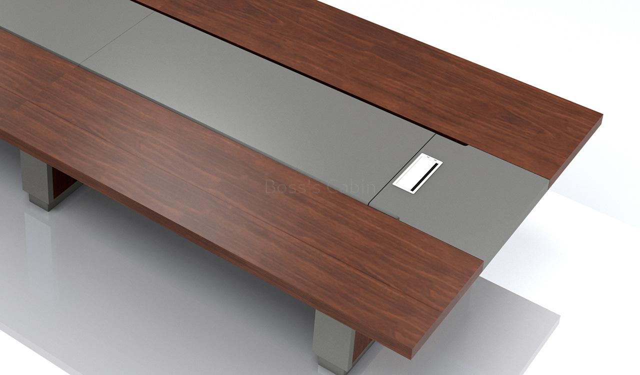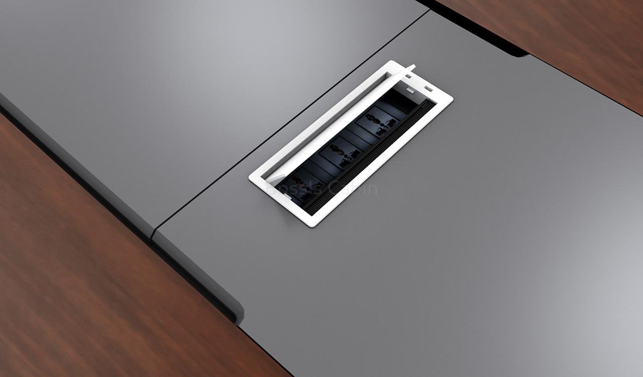 1. Table top in veneer and leather. 2. Full length veneered base. 3. Two muti-function wireboxes with power, CAT.6 and HDMI ports.