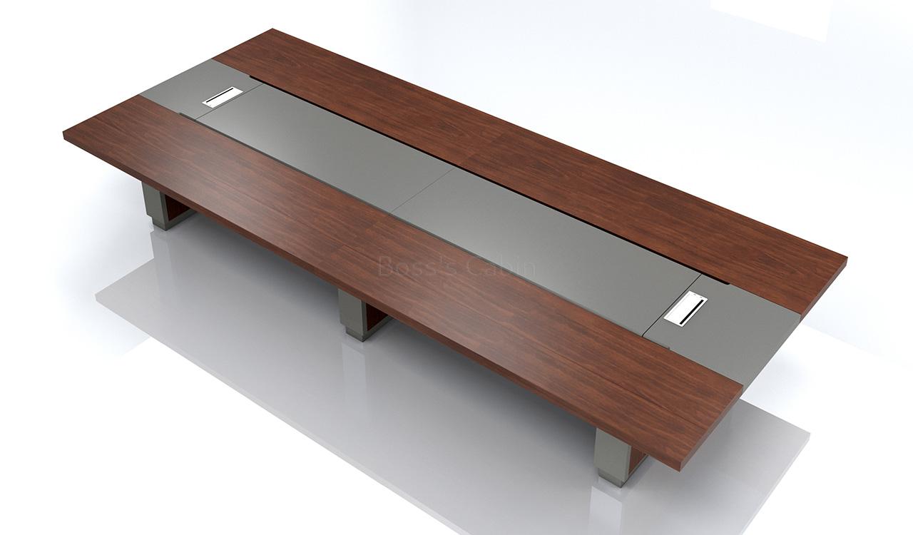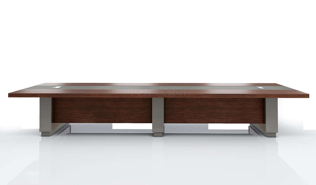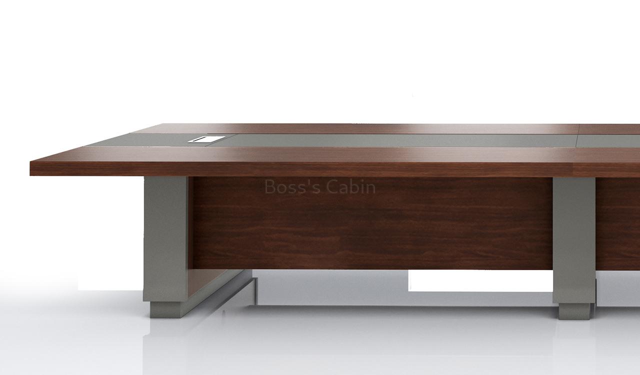 An elegantly designed 16 seater conference table, perfect for large meeting rooms and boardrooms. Finished in a rich blend of finely textured Mountaingrain walnut veneer and gray leather, it features a concealed wire management system with two socket boxes housing power, CAT.6, and HDMI ports. Solid panel legs and a full-length privacy panel enhance its structured, premium look. Impeccably crafted, this Larry series table is a sophisticated centerpiece for any plush office environment.