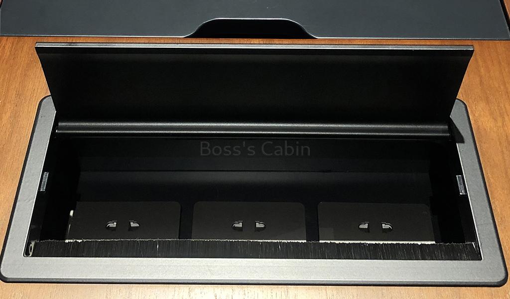 A premium finish, rectangle shape boardroom table with rounded corners and chamfered edges. Designed in manually cut open pore walnut veneer and carbon black base the table has inbuilt wire routing provisions through the base that connect to the two wireboxes placed on the heads of the table. The wireboxes come with cut outs for fixing sockets. A part of our premium MT series, it is an excellent choice for luxurious office interiors.