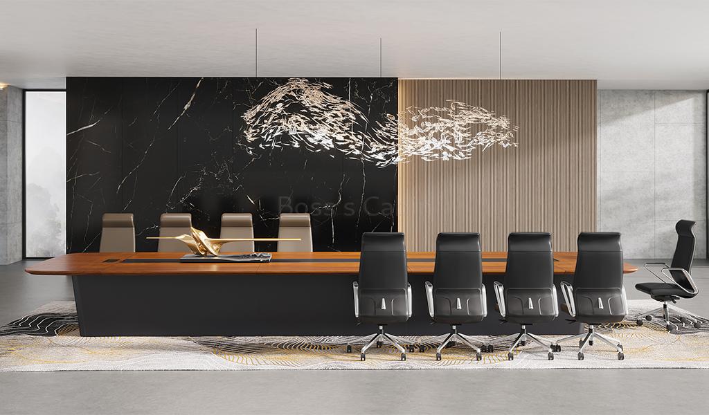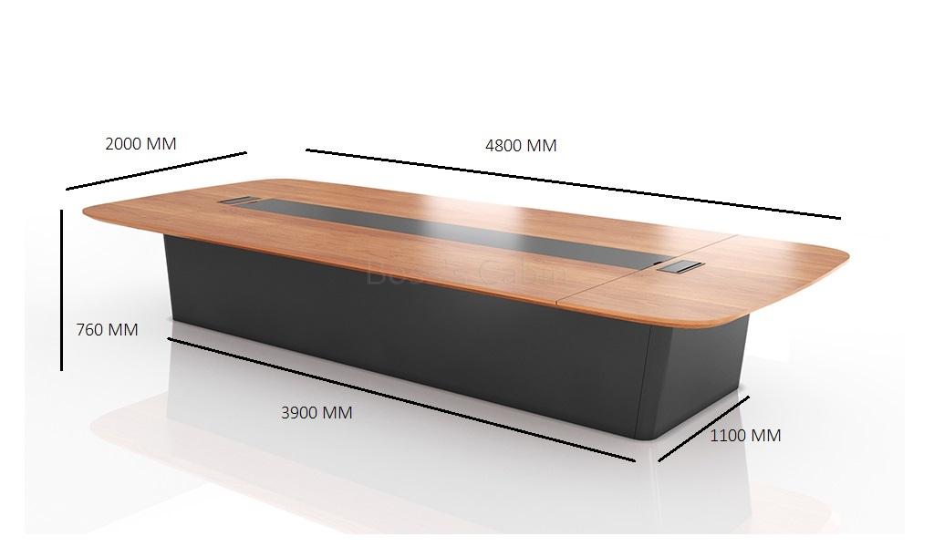 This meeting table is part of our premium conference table series called MT. Conceived and designed to adapt to different environments this 16 feet conference table can be customized in different veneer finishes. This particular one is finished in manually sawn rift-cut walnut and carbon black combination. The table is designed with wiring provision through its base that connect to the wirebox on the top. Crafted with a combination of veneer, leather and solid color base it is built for lasting durability, plush feel and luxurious looks. You can also choose an entire range of varying sizes from this series to furnish different parts of your office. Go to our catalog section to download the catalog.