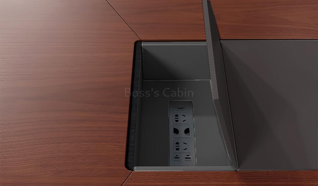 1. Veneer tabletop with a leather inlay in the center. 2. Fully covered wooden base. 3. Two inbuilt wire management boxes with power and data ports.