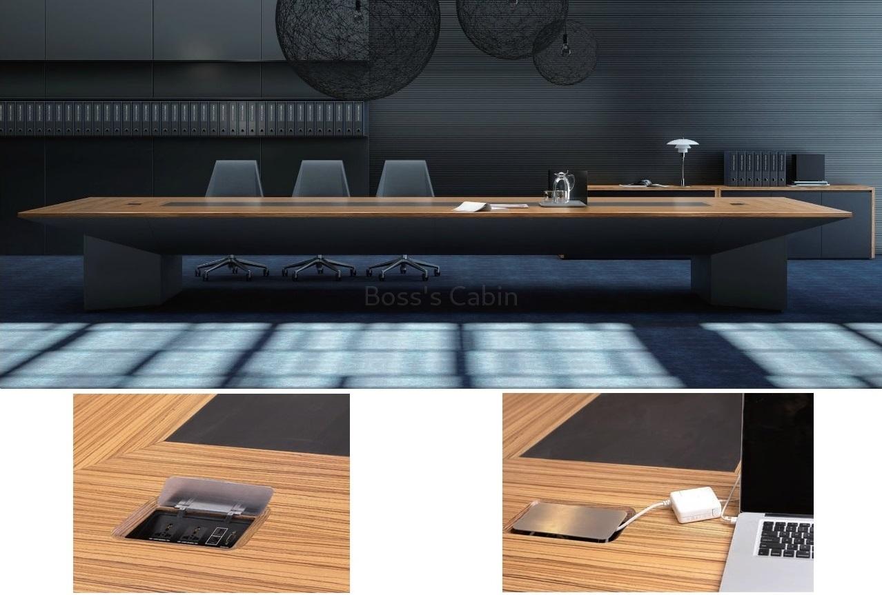 1. Zebra wood & leather finish tabletop. 2. 45 degree angle bridge span design base in dark gray lacquer. 3. Two inbuilt wireboxes with ports for phone, data and power and VGA.