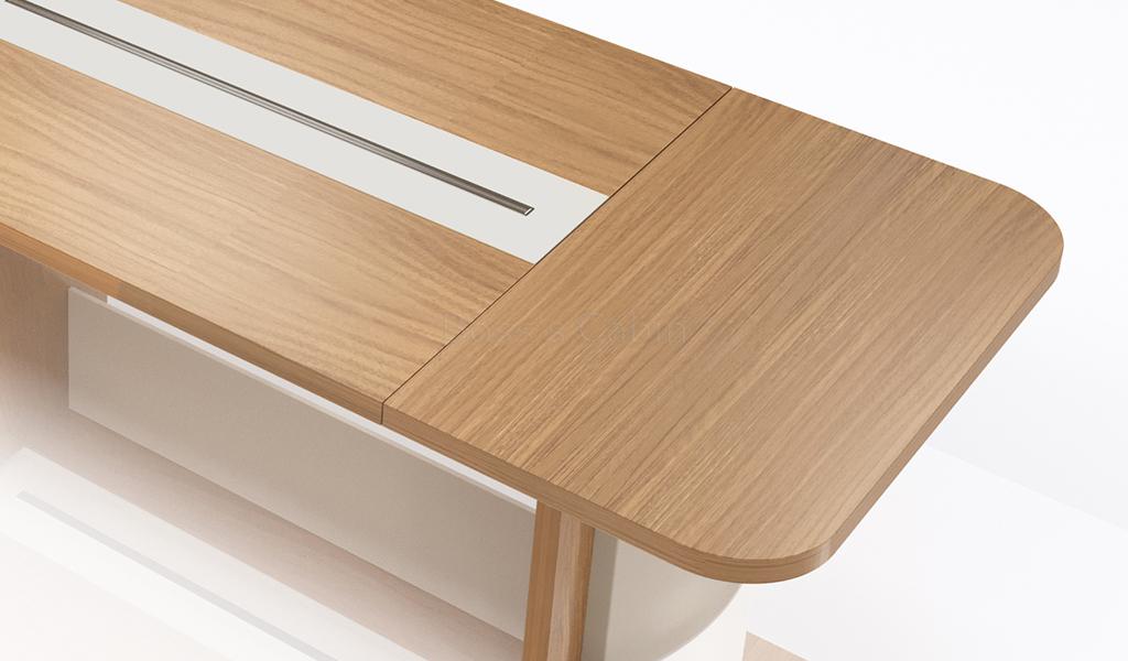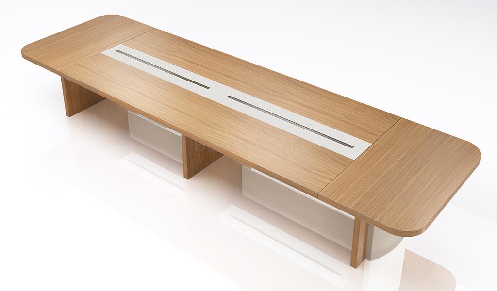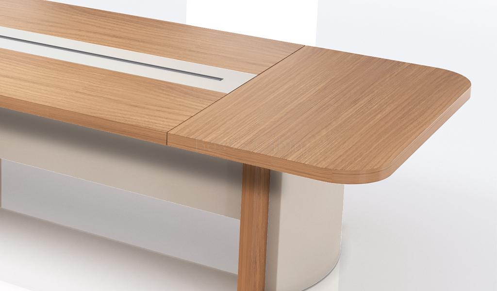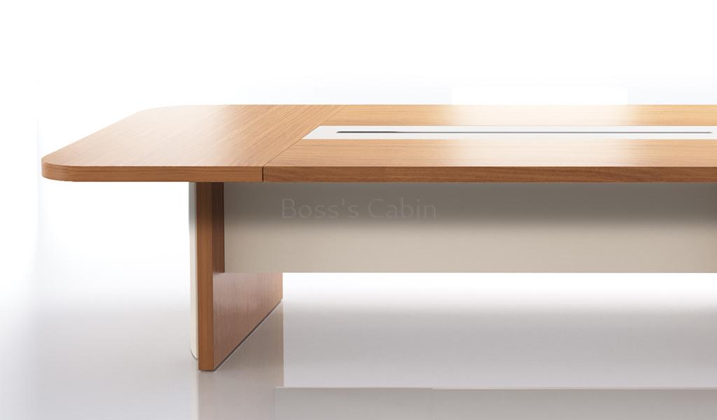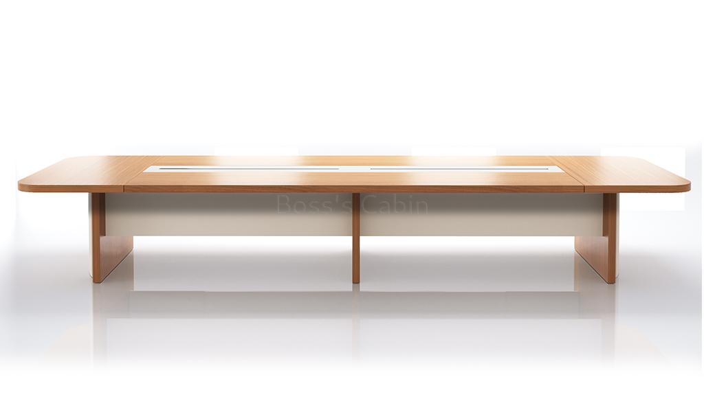 Meeting table in 16 feet width made with environment grade engineered wood and sandalwood laminate. The E1 grade MDF is a highly durable material and a world standard for premium office furniture while the sandal wood laminate is from our carefully selected range of premium laminates with consistent color and grain structure.