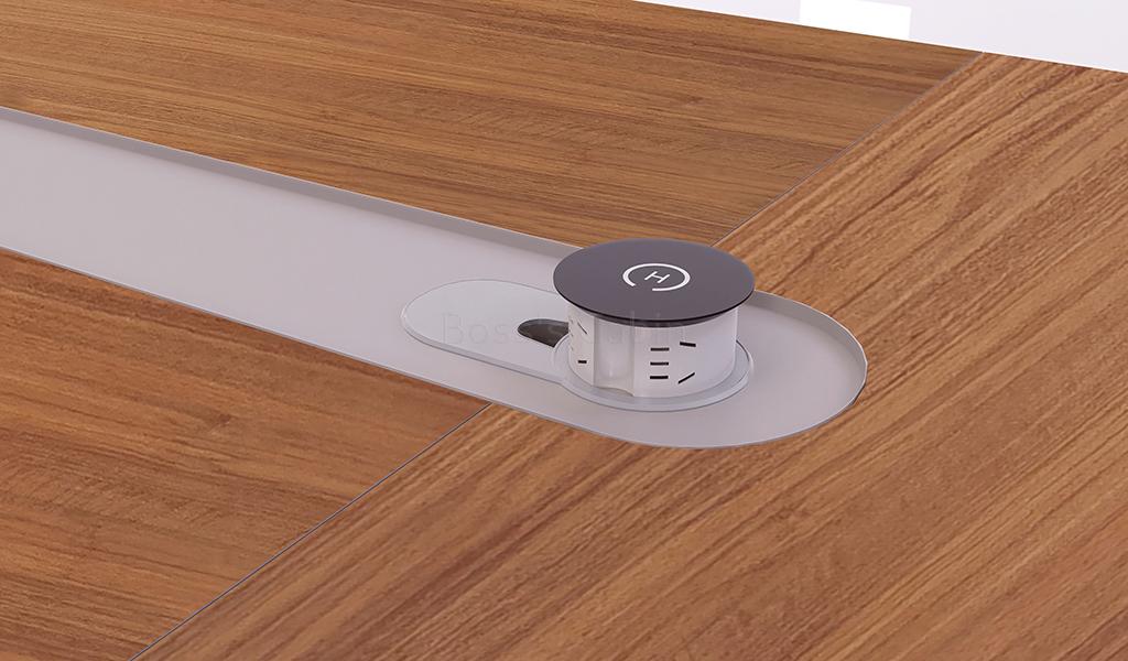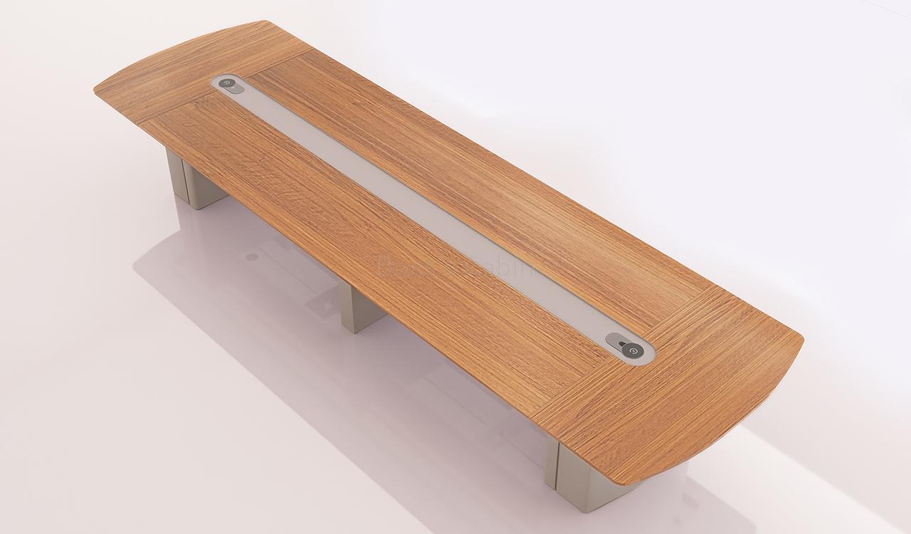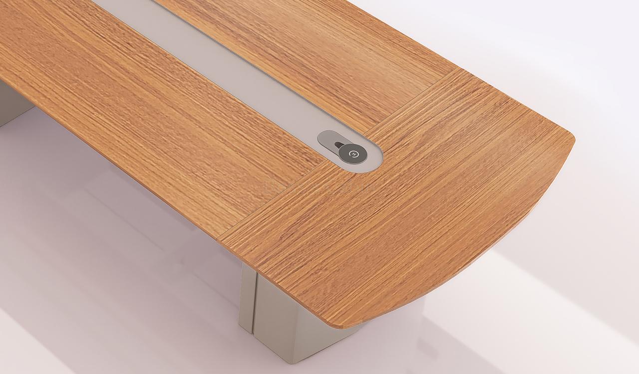 An elegant 16-ft boardroom table in golden sandalwood and seagull gray laminate. This dual-tone piece features rounded corners, chamfered edges, and curved pedestal legs for refined aesthetics. Integrated pop-up sockets ensure a clutter-free workspace. Ideal for boardrooms and conference rooms, it pairs seamlessly with all Swan Series products.