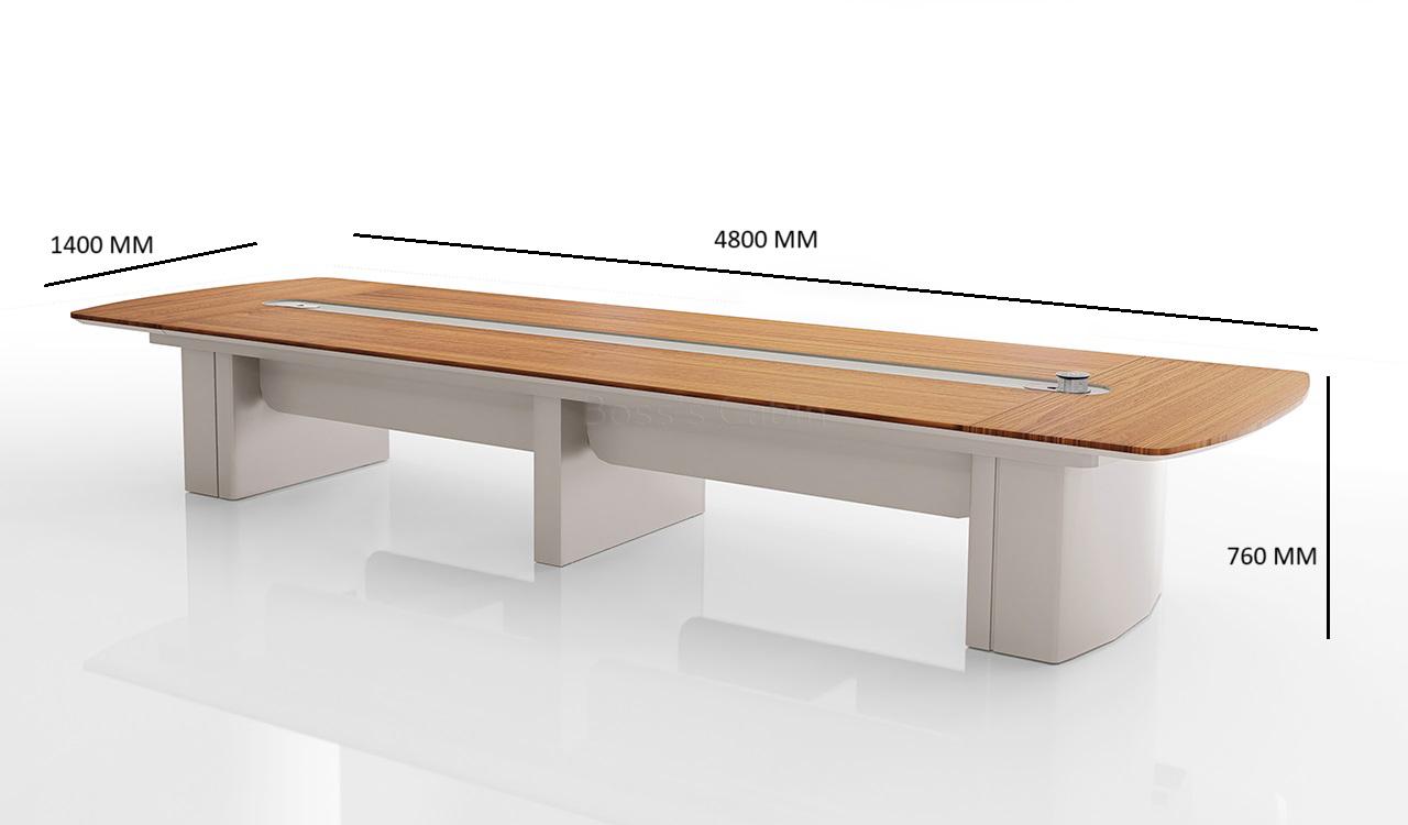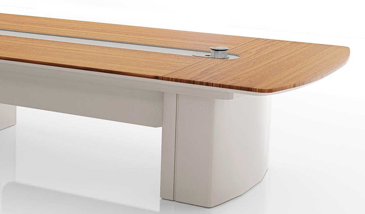 Meeting table in 16 feet width made with environment grade engineered wood and sandalwood laminate. The E1 grade MDF is a highly durable material and a world standard for premium office furniture while the sandal wood laminate is from our carefully selected range of premium laminates with consistent color and grain structure.