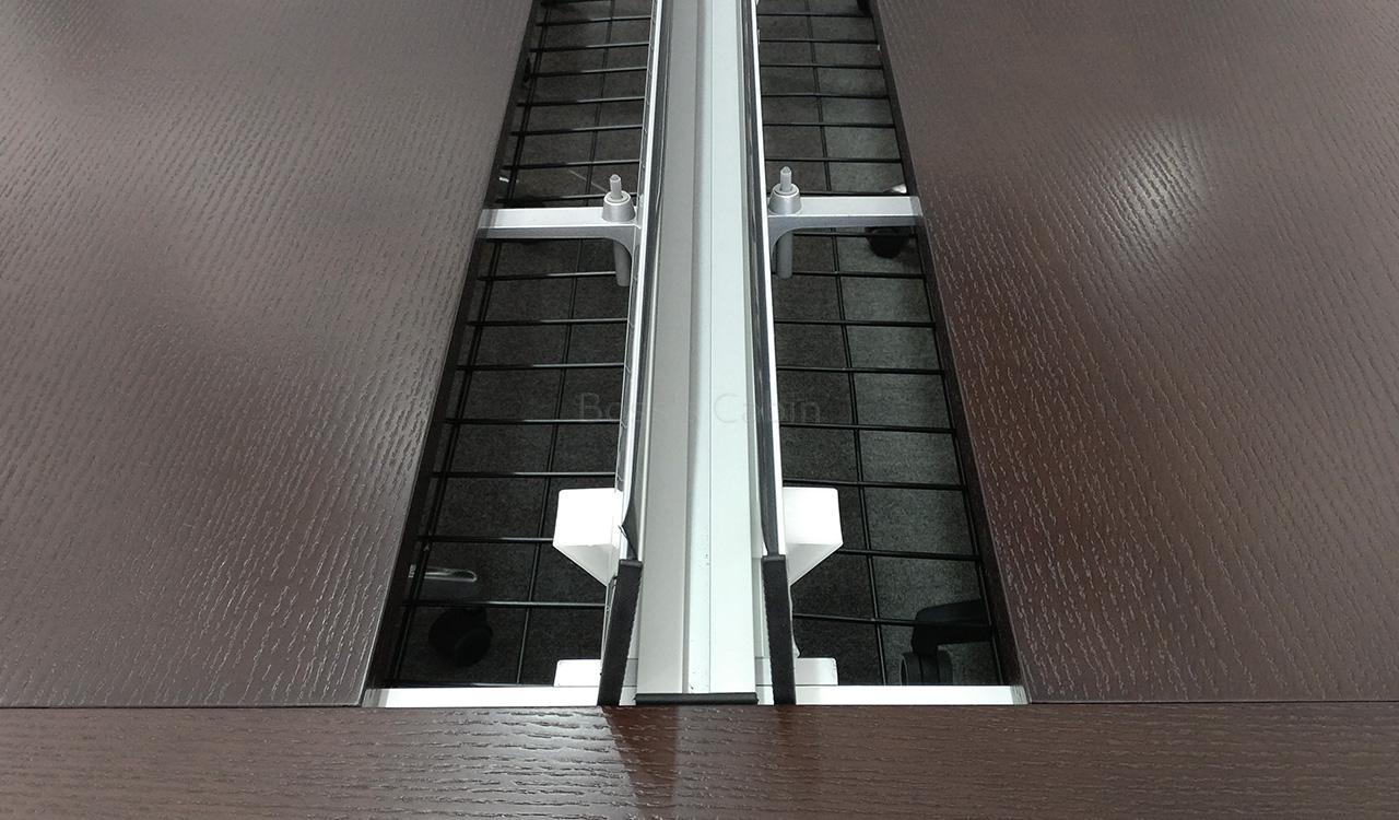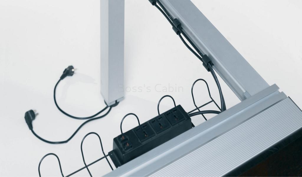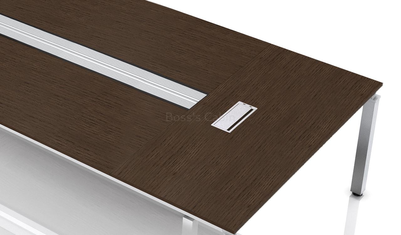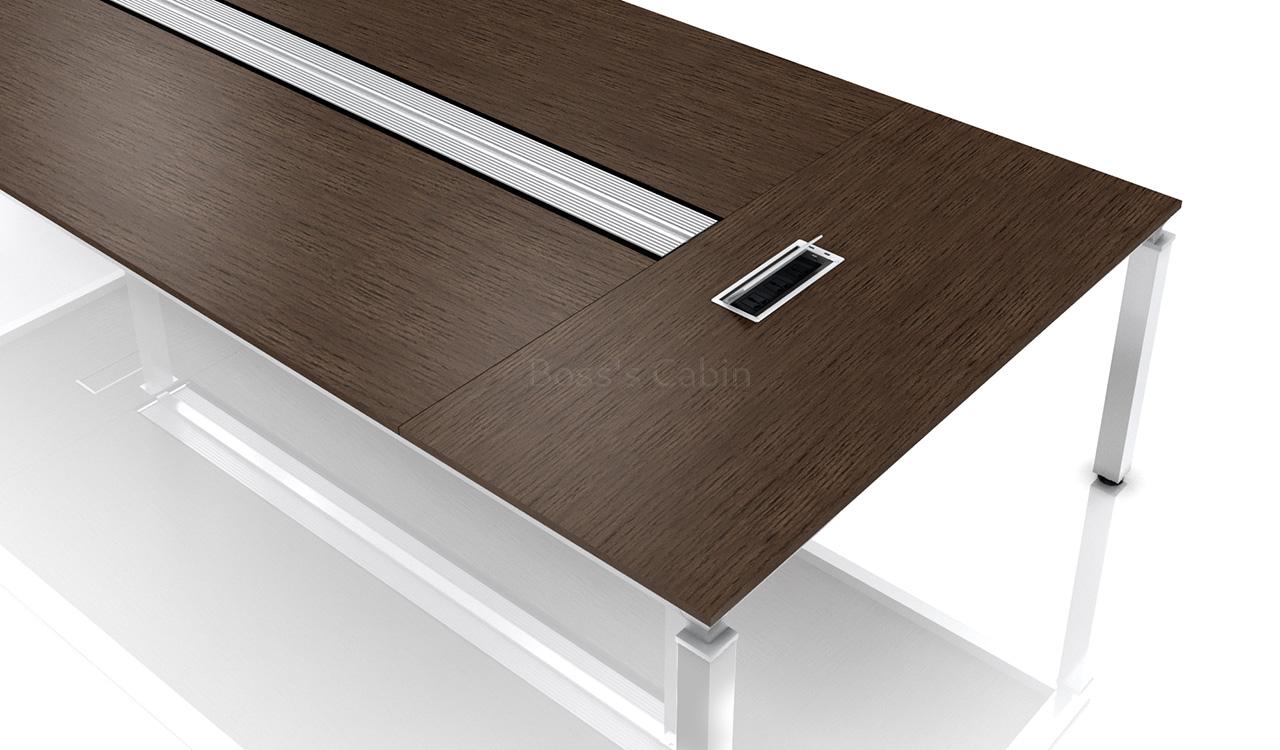 Main conference table with inbuilt, flip-top wire tray in the center and silver finish aluminum legs. Also included are two wireboxes with data, power and telephone ports.