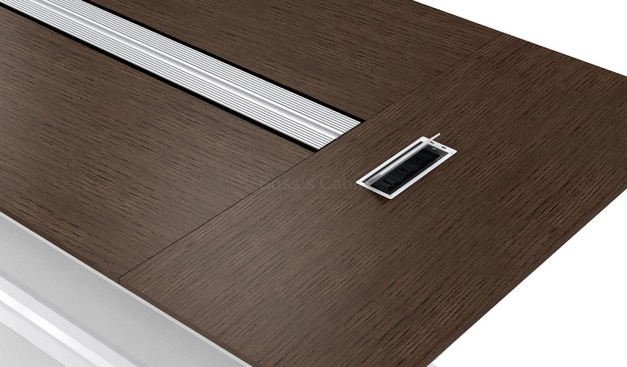 A 12 seat conference table in open grain veneer with an elaborate wire management system that connects all the people sitting around the table. Designed with a long flip-open wire tray, this contemporary meeting table also has two wireboxes with sockets for power and data for a clutter free work surface. Built with top quality composite wood and veneer for lasting durability, natural feel and luxurious looks. It is part of the Eazy series from which you can choose an entire range of matching cabinets, office tables, workstations and conference tables etc to create a complete office. Go to our catalog section to download the entire catalog.