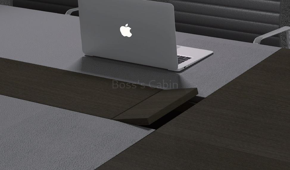 Conference table with leather and veneer top and inbuilt cable management system.