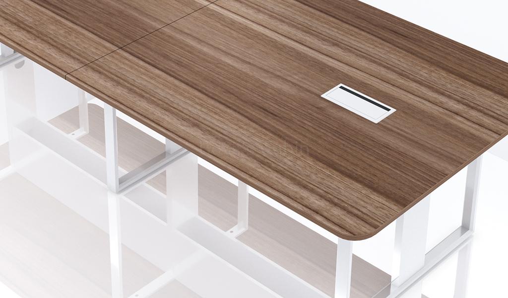 1. Laminate finish table top with two cable boxes on desktop. 2. Modesty panel under the desktop 3. Loop shape metal legs and frame.