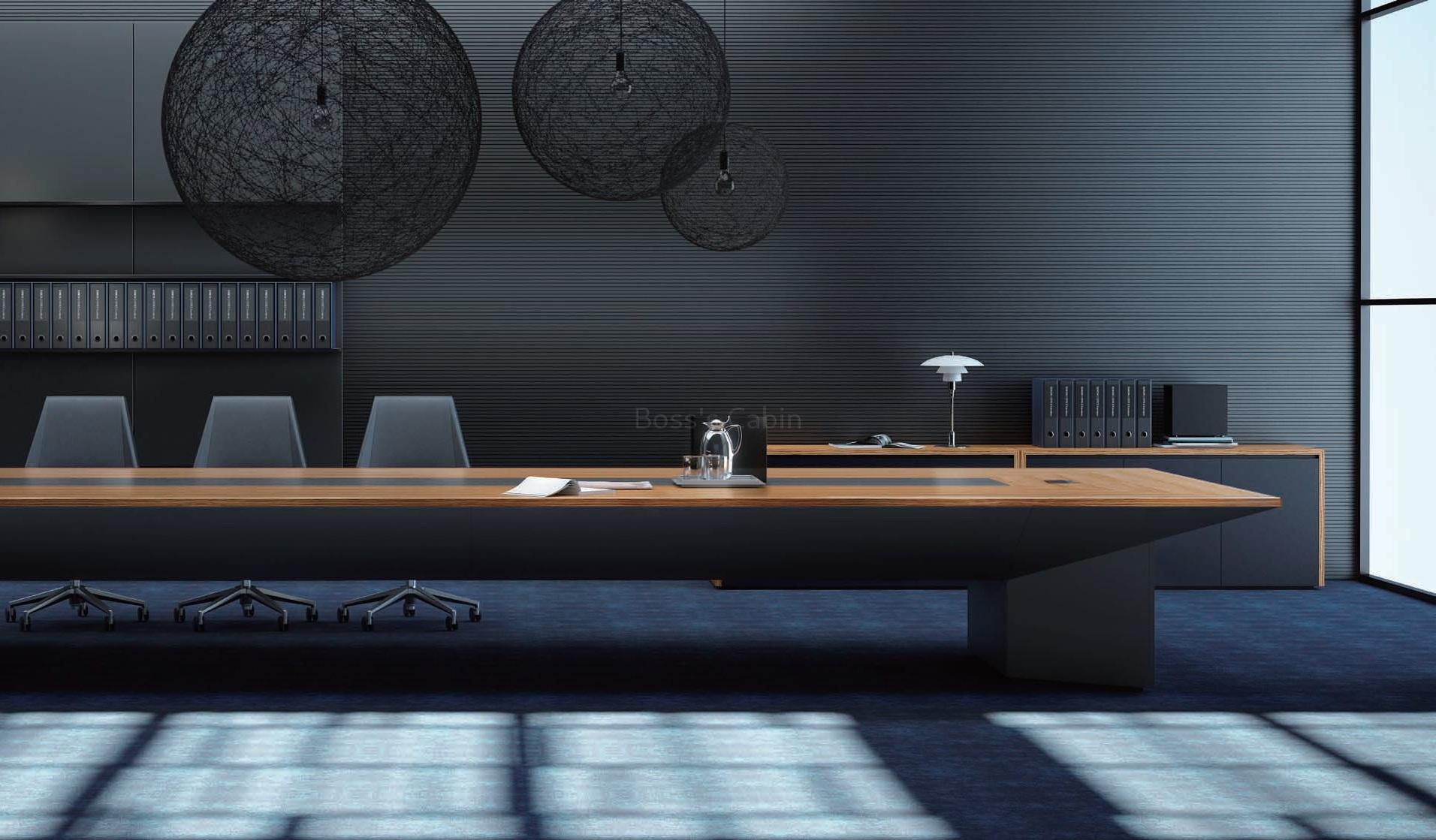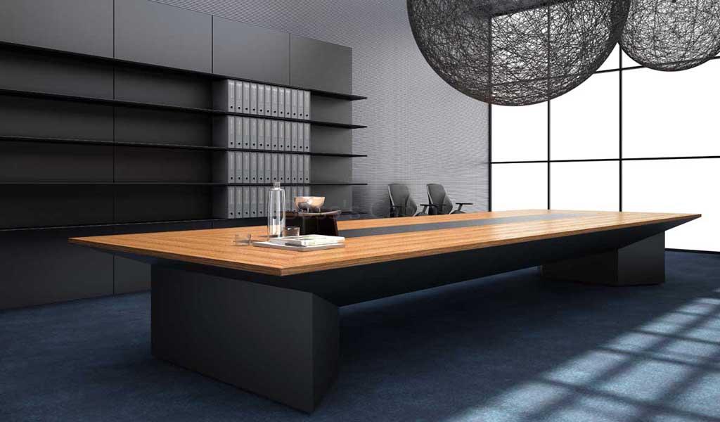 1. Zebra wood & leather finish tabletop. 2. 45 degree angle bridge span design base in dark gray lacquer. 3. Two inbuilt wireboxes with ports for phone, data and power and VGA.