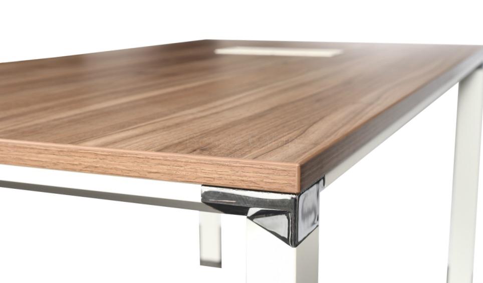 Designed for a small conference room this six seater meeting table is finished with walnut laminate worktop and white lacquered base. Crafted with the highest quality engineered wood and laminate for lasting durability and luxurious looks it also includes a wirebox for managing your power and data cables.. It is part of the E-Half series from which you can choose an entire range of matching cabinets, office tables, workstations and bigger conference tables etc to create a complete office. Go to our catalog section to download the the entire catalog.