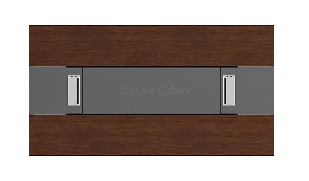 An elegantly designed 8 feet meeting table, perfect for compact meeting rooms and boardrooms. Finished in a rich blend of finely textured Mountaingrain walnut veneer and gray leather, it features a concealed wire management system with two socket boxes housing power, CAT.6, and HDMI ports. Solid panel legs and a full-length privacy panel enhance its structured, premium look. Impeccably crafted, this Larry series table is a sophisticated centerpiece for any plush office environment.