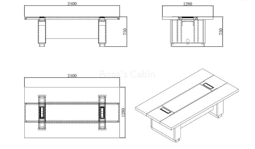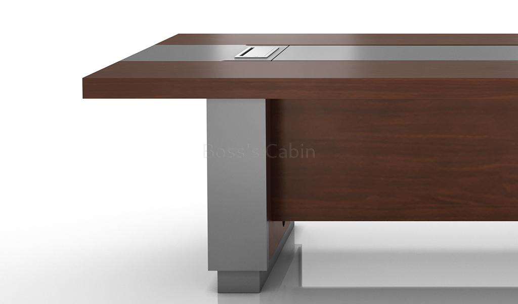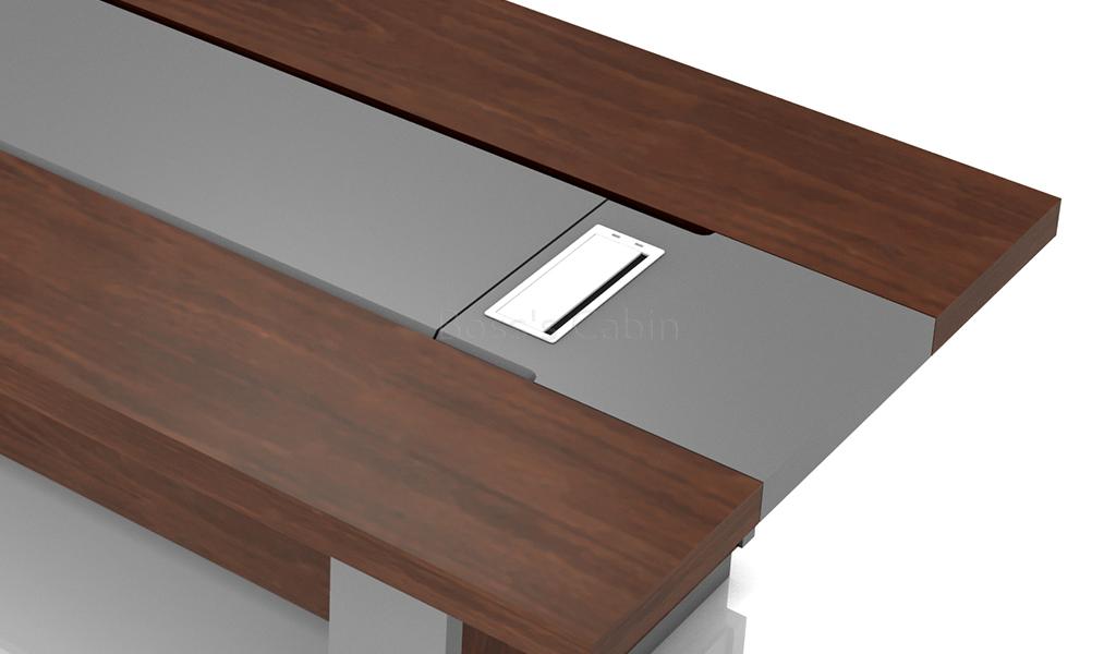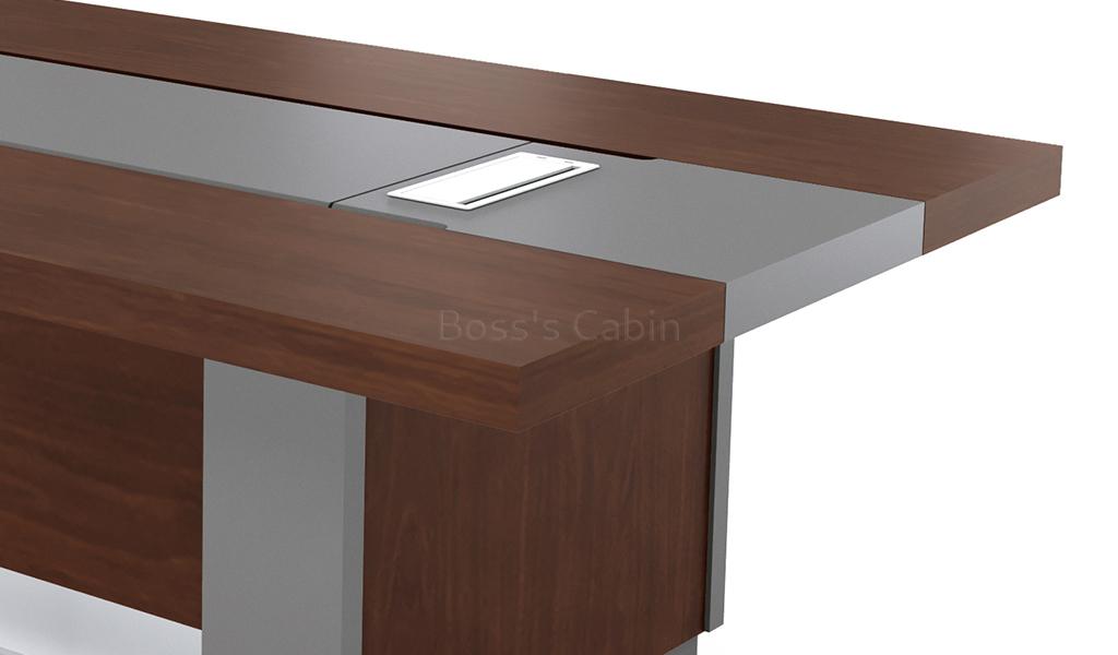 1. Table top in veneer and leather. 2. Full length veneered base. 3. Two muti-function wireboxes with power, CAT.6 and HDMI ports.