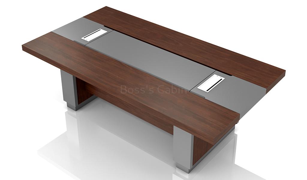 A premium 8 seater walnut veneer & leather finish meeting table suitable for small boardrooms and private meeting rooms