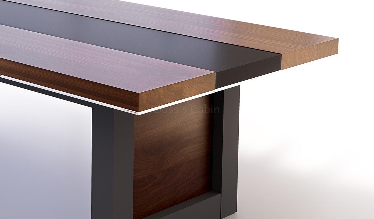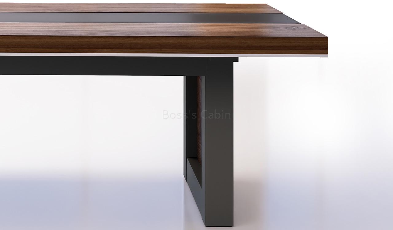 An elegant 8 feet width meeting table finished in walnut veneer with a leather inlay and chrome edge banding. The base features veneered panel legs supported by a black lacquered frame. Part of the distinguished Lexon Series, it’s an ideal choice for elegantly appointed meeting rooms, combining refined aesthetics with practical functionality.