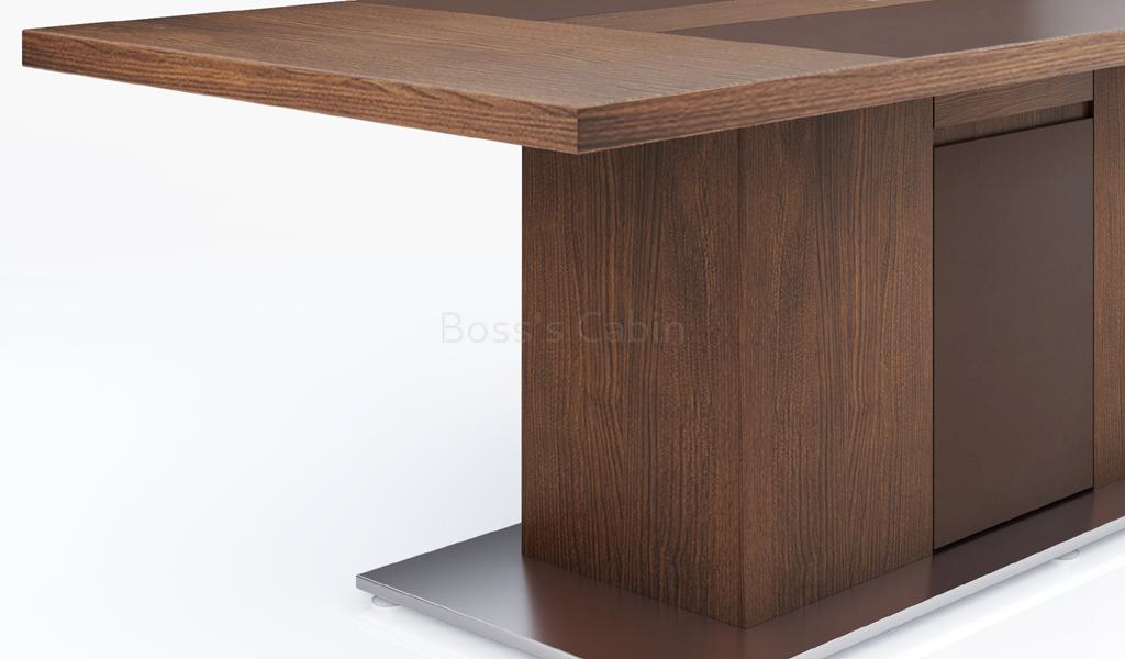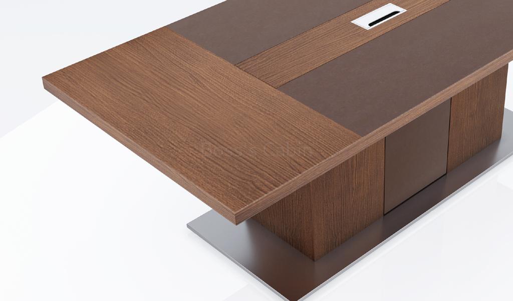 An elegantly designed 8-seater meeting table, finished in a rich combination of King Walnut and Kano Gray laminates. The dual-tone tabletop features an integrated wirebox for easy connectivity. Supported by a wide pedestal base, the table includes a seamlessly designed trap door for efficient cable routing. A flat stainless steel base adds a touch of sophistication. Ideal for small meeting rooms, it pairs perfectly with all Miro series products.