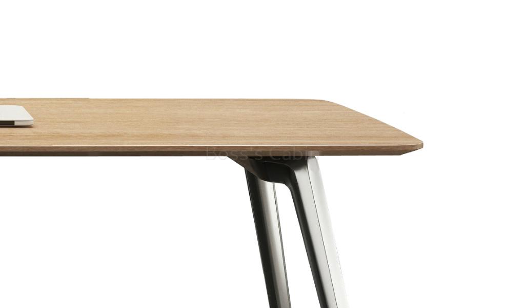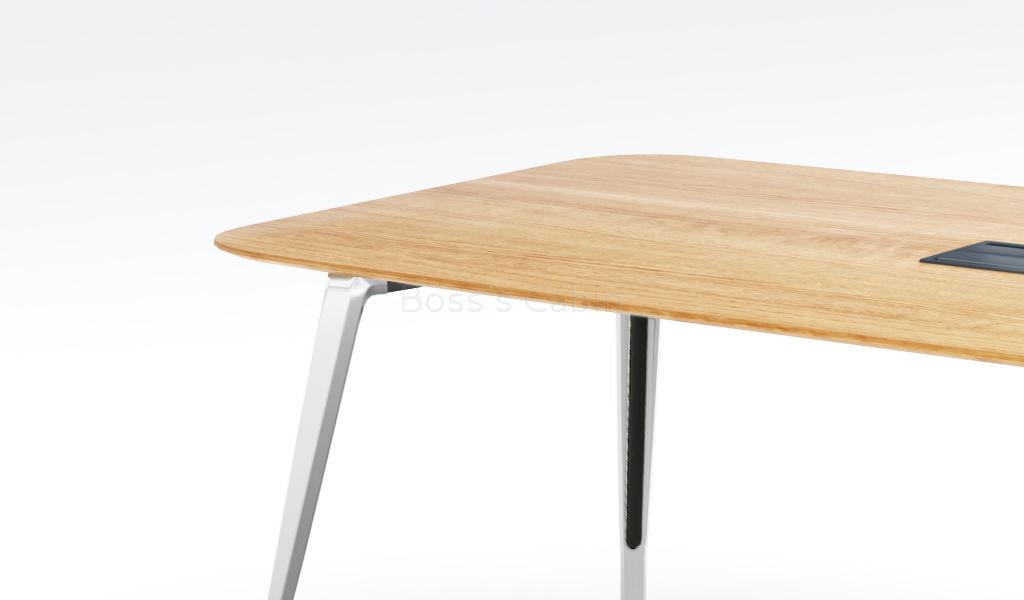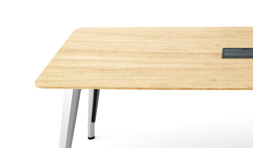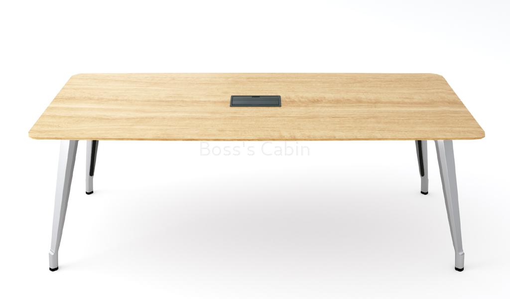 A sleek and contemporary 6 to 8 seater meeting table in trendy light oak laminate. Designed with chamfered edge desktop and stylish multi-dimensional aluminum alloy legs with a smooth & glossy surface. The slim desktop is finished with ABS laser edge banding and one inbuilt wirebox. A perfect choice for the trendy office.