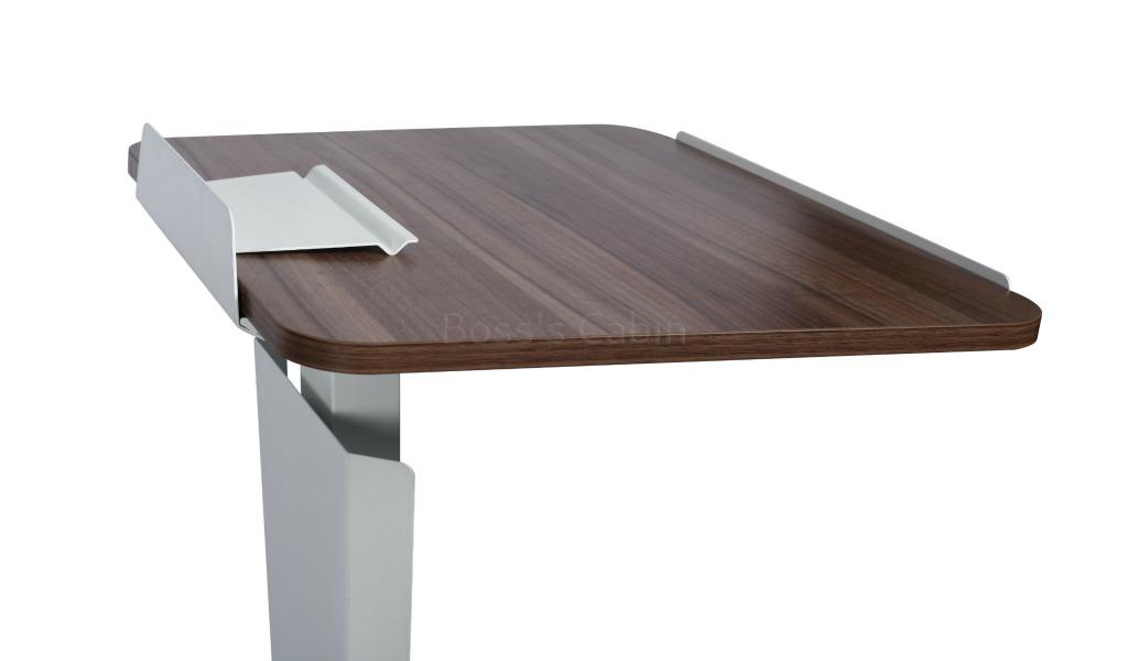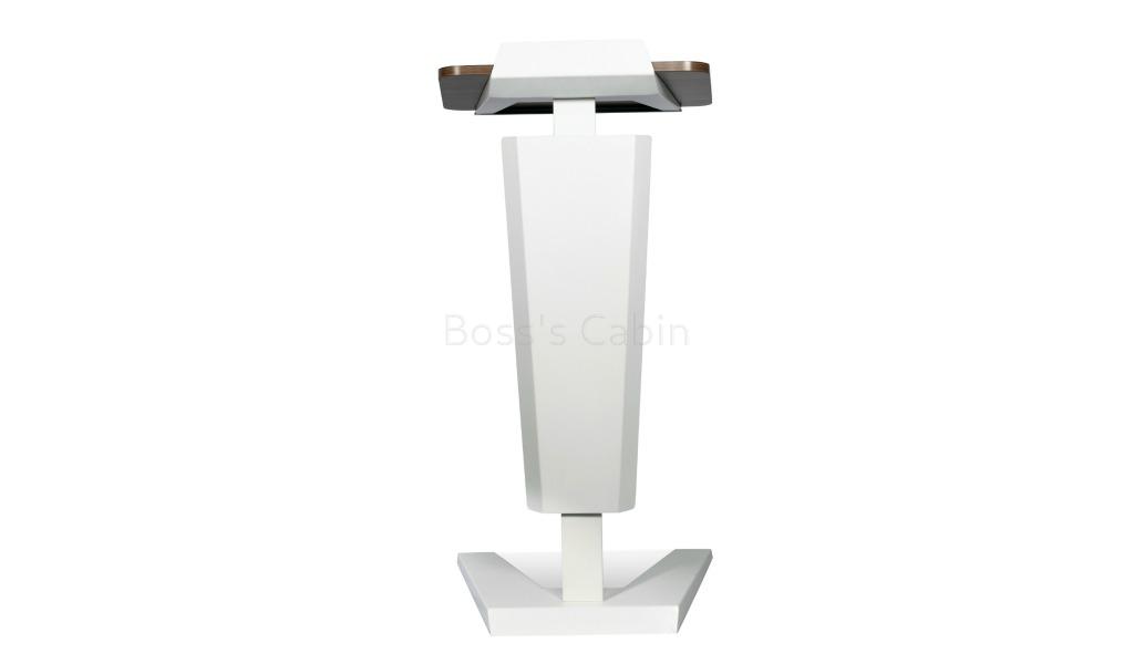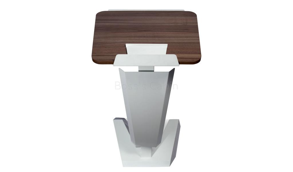 A contemporary and sleek podium with a walnut laminate work top and white powder coated metal base. A perfect combination of functionality and thoughtful design, it incorporates an inbuilt paper clip for better organizing your documents.
