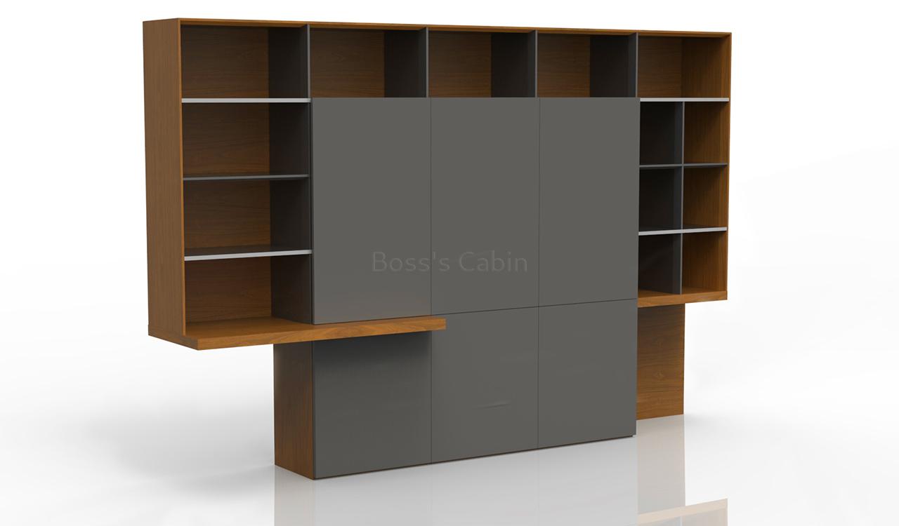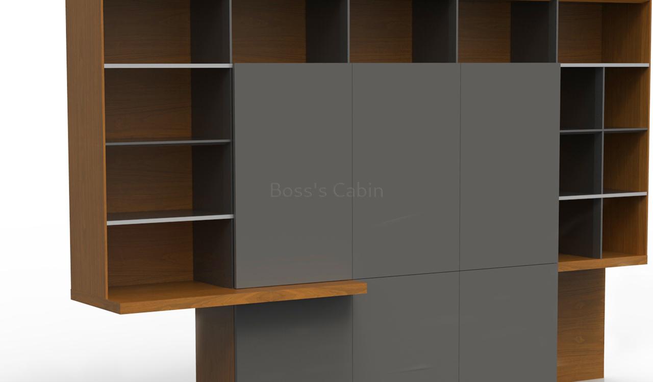 A 7 feet high storage cum display cabinet finished in open pore walnut veneer and dark gray leather. Fitted with premium Blum and Hettich hardware it is designed in a combination of open shelves, sliding doors and flip doors. Recommended to be used as a rear storage and display unit in your office cabin along with the Aulenti series of desks. Built with the superior E0 grade MDF wood and walnut veneer for lasting durability, natural feel and luxurious looks. It is part of the Aulenti design series from which you can choose an entire range of smaller cabinets, office desks, conference tables etc to create a complete office. Go to our catalog section to download the entire catalog.