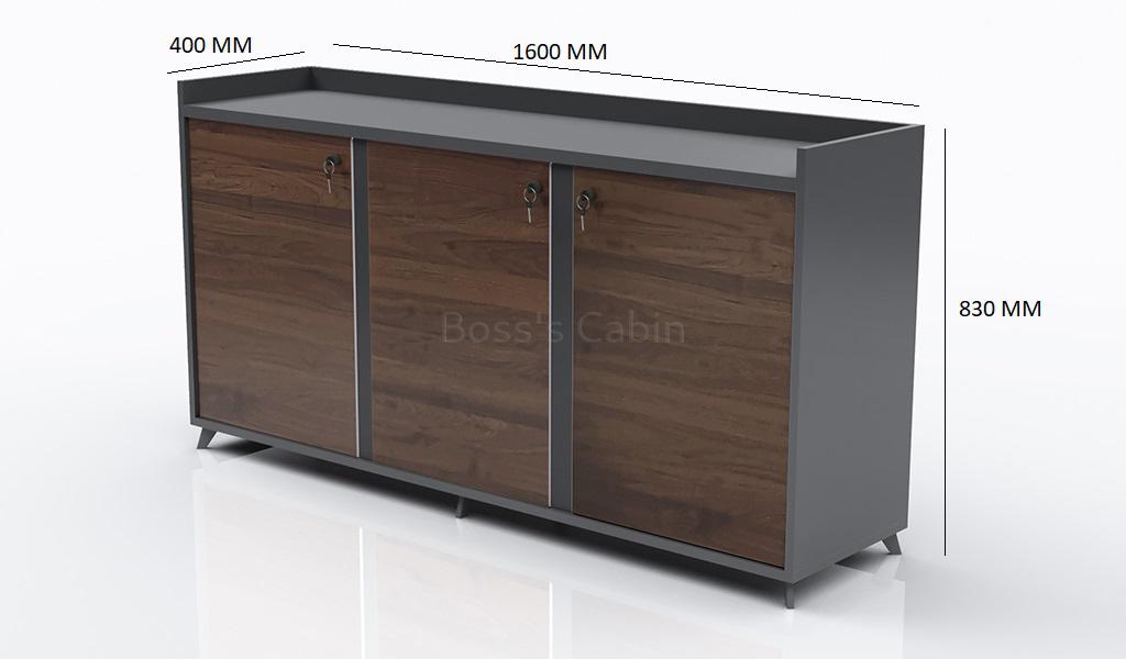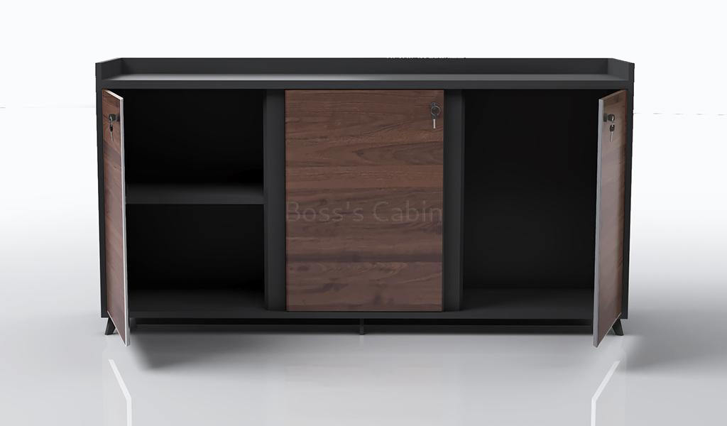 A 5 feet office cabinet in a combination of rich walnut and carbon gray laminate. Designed with three doors with shelves its a perfect choice as a rear cabinet in your office cabin. The doors are deliberately designed with grooves instead of handles to give it a smooth and sleek look. To be matched with Inspira series desks.