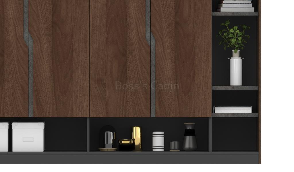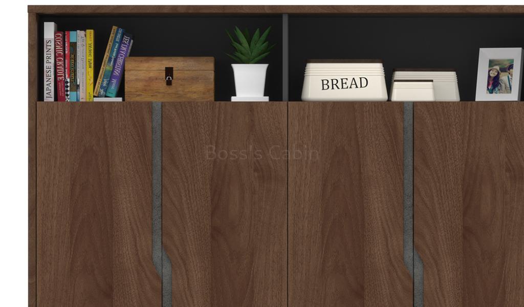 A 6 feet office cabinet in a combination of rich walnut, rock gray and carbon gray laminate. Designed with doors and open display shelves its a perfect choice as a rear cabinet in your office cabin. The doors are deliberately designed with grooves instead of handles to give it a smooth and sleek look. The open shelves can be used for books and artefacts. To be matched with Inspira series desks.