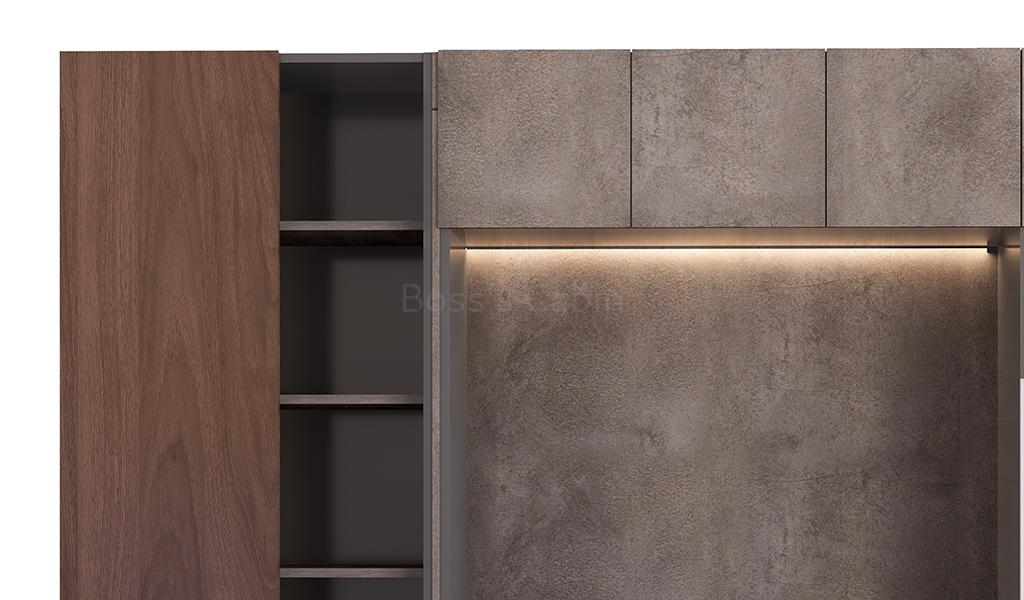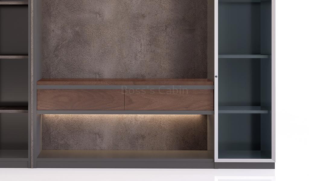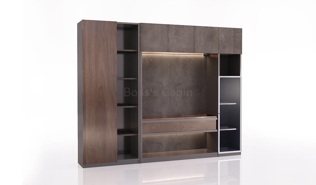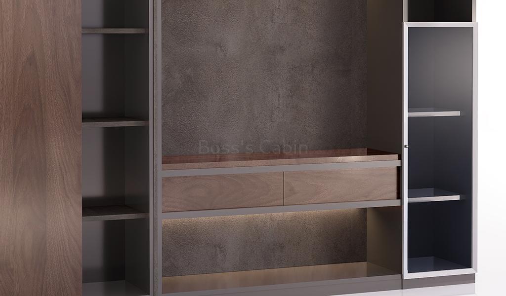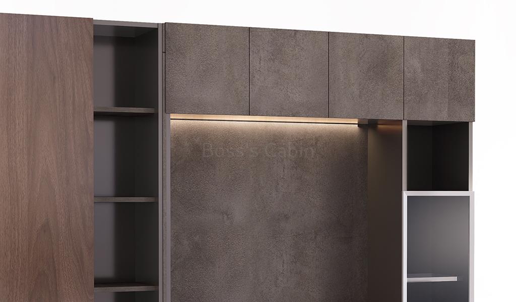 An 8 feet width office cabinet finished in rich walnut, rock grey, and carbon grey laminates. Designed with multiple doors and open display shelves, it serves as an ideal rear cabinet for executive cabins. Handle-free grooved doors offer a sleek, seamless look, while the open shelves are perfect for displaying books and artifacts. Integrated LED concealed lighting adds a refined touch. Best paired with desks from the Inspira series for a cohesive workspace design.