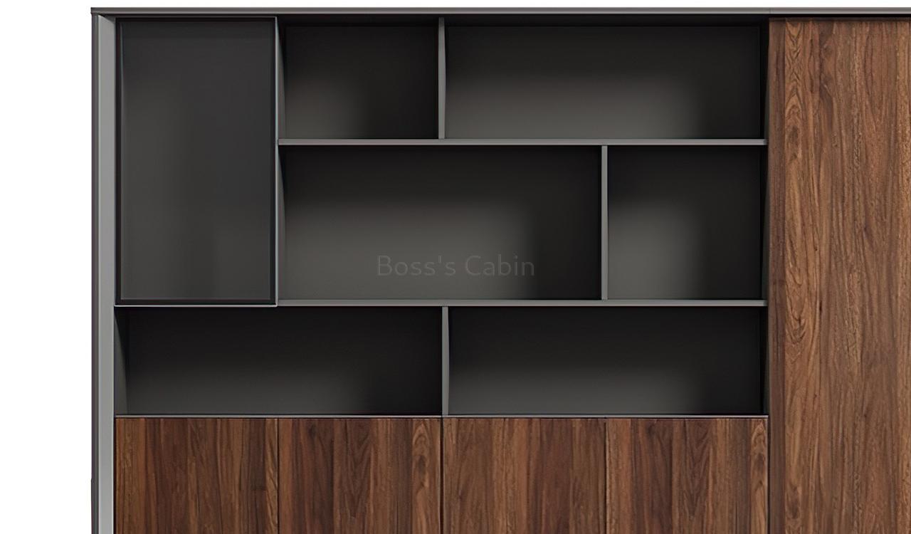 A full-height, 9 feet width office cabinet and bookcase, combining open shelving, glass-fronted sections, solid wooden doors, and a built-in wardrobe. Finished in Felix walnut and meteor gray laminate, with handleless doors and FGV damping hinges for a clean, seamless look. Part of the Maxima series its ideal for spacious cabins, home studies, and libraries.