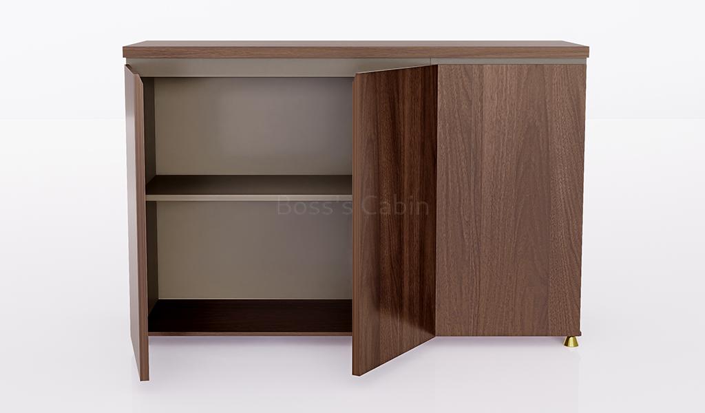 A functional and sleek office cabinet with three doors and two rows of shelves. Designed as a multi-utility storage and filing cabinet this low height credenza can be used in any area of your office. Finished in King walnut and Kano gray laminate it pairs well with all Miro series products.