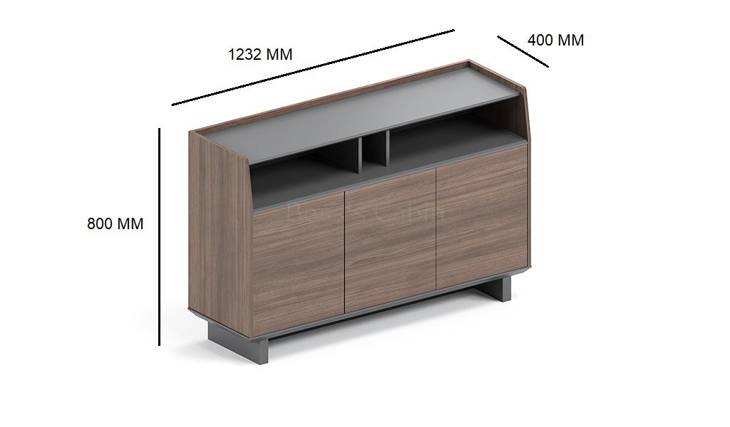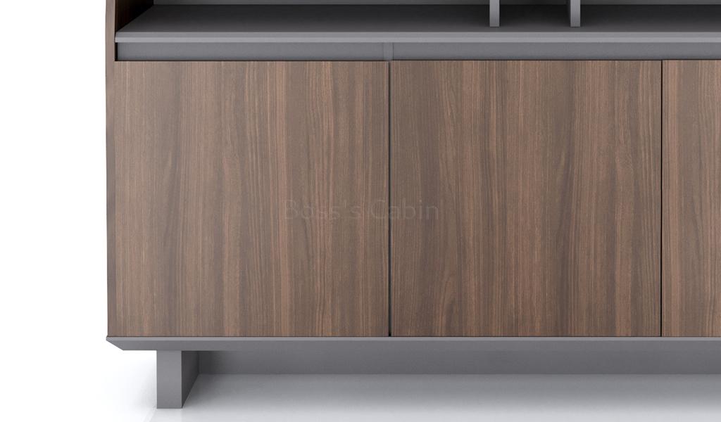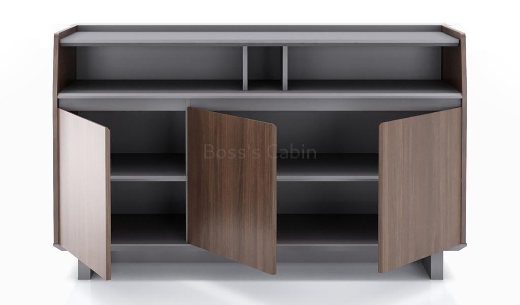 A multi-purpose filing cabinet and credenza designed for use in various areas of your office. Finished in a combination of Pari walnut and advanced gray laminate the cabinet has three doors with two shelves inside and one open top shelf. Part of the Nexa series it can be used as a rear cabinet for office cabins, as a sideboard for meeting rooms & pantry areas and as a filing rack anywhere in your office.