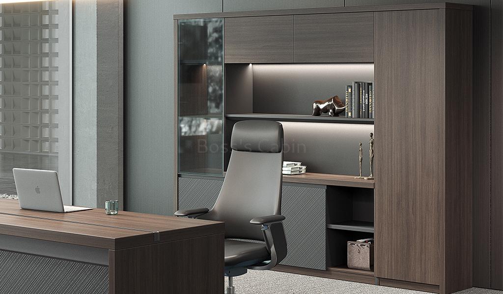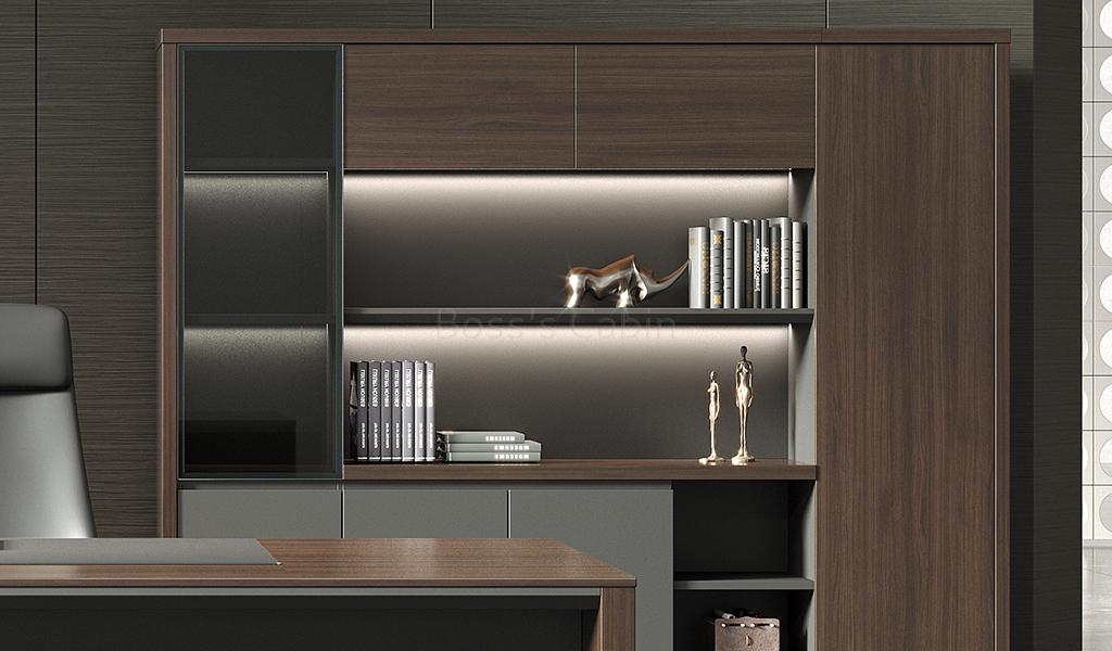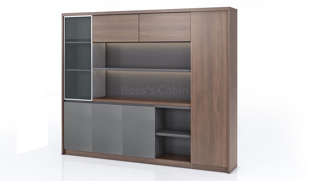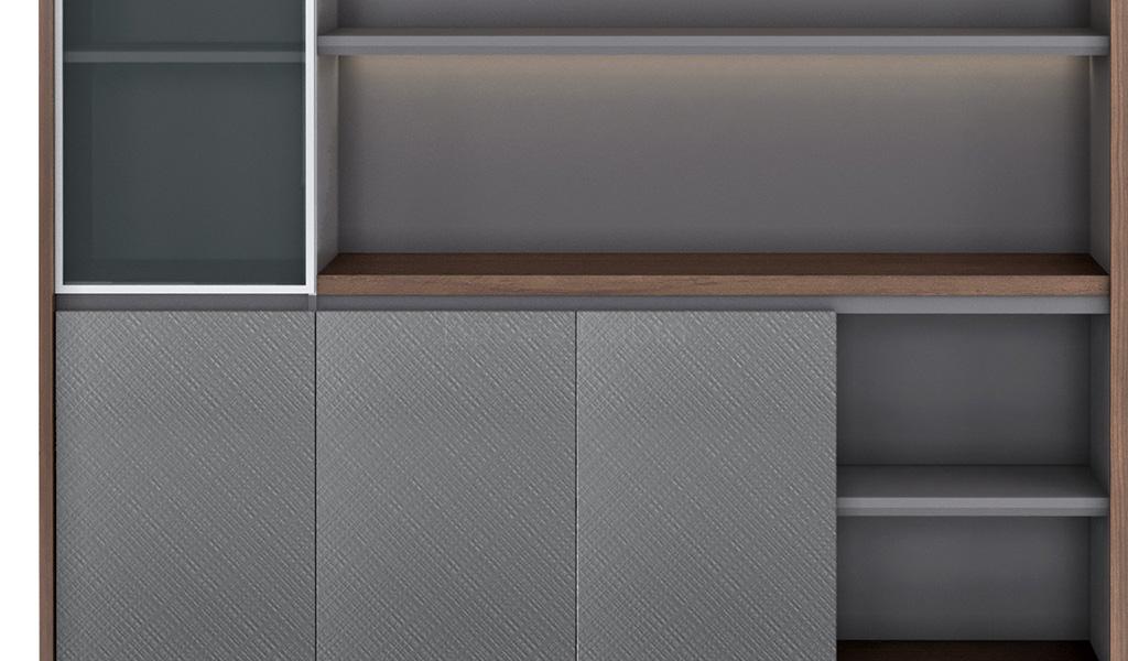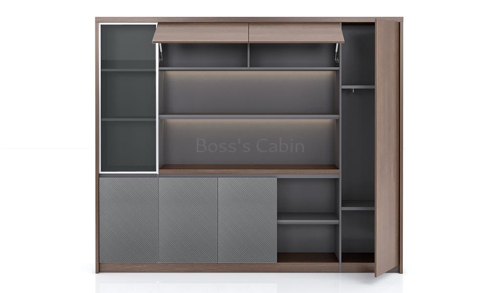 The large, multi-purpose filing cabinet and bookcase from the Nexa Series is designed for versatile use across office spaces. Finished in a sophisticated combination of Pari Walnut and Advanced Grey laminates, it features multiple sections for storage and display, including a grey-tinted glass door. Open shelves with concealed LED lighting add a modern touch, while a tall wardrobe section enhances its functionality.