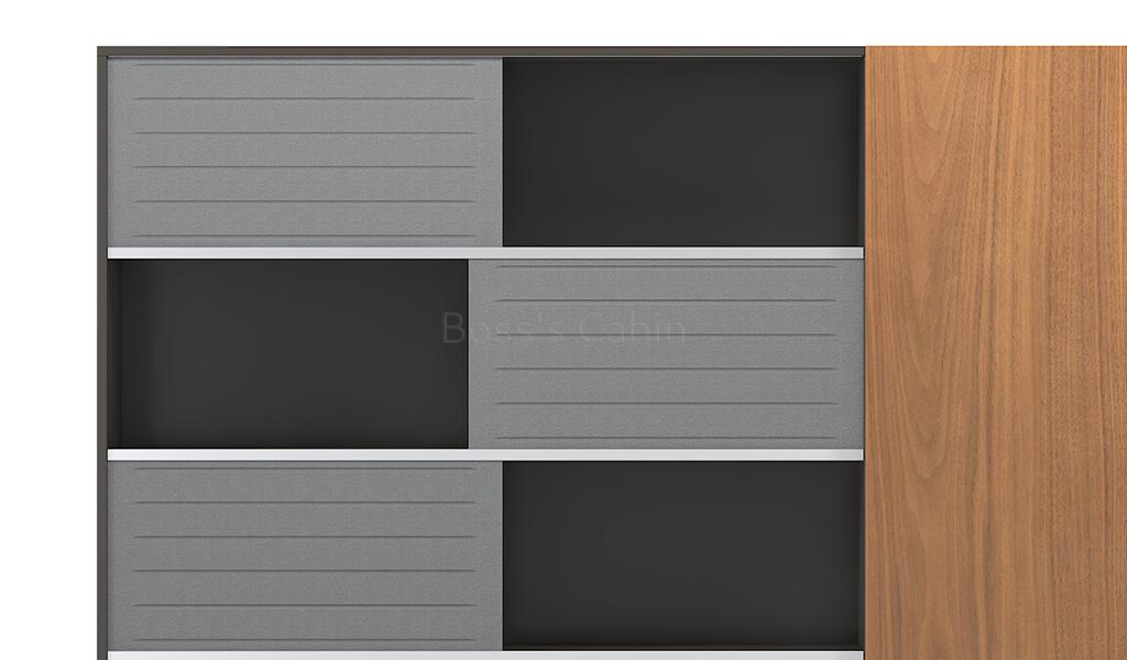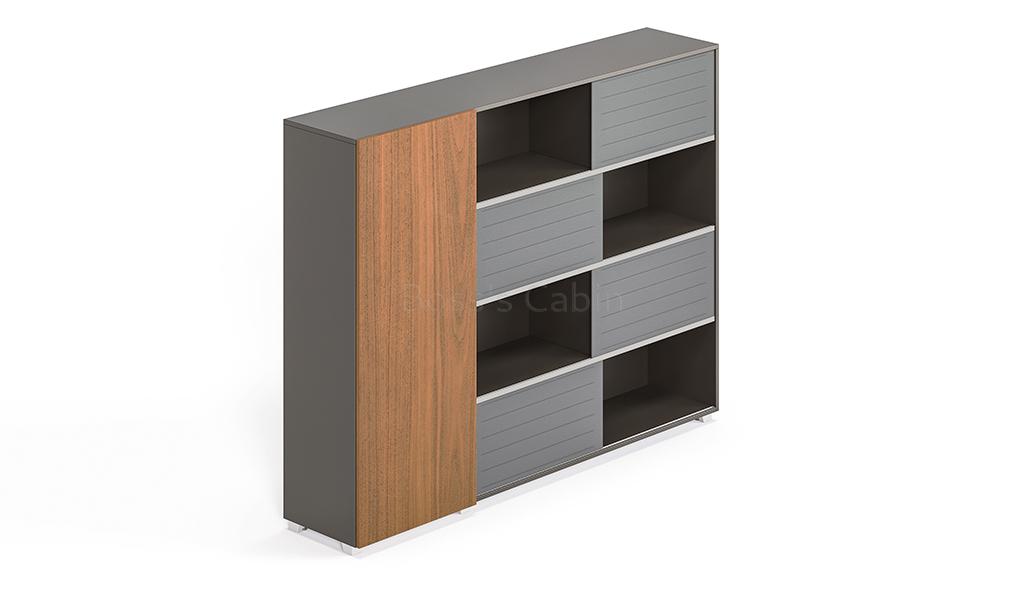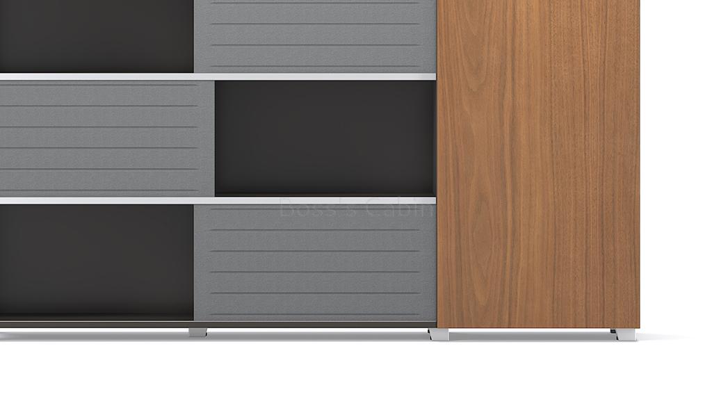 A sleek rear cabinet and book shelf designed for modern office interiors, this storage cabinet is part of the Varna design series. Finished in open pore walnut veneer & meteor gray laminate. The smaller doors of the cabinet have sliding functionality and are designed in gray felt material. Ideal for office cabins, home office and common office areas.