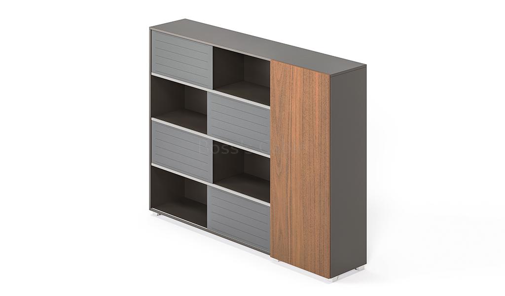 This office cabinet and bookshelf is part of our luxury executive furniture series called Varna. Conceived and designed as part of the modern executive series this premium rear storage cabinet is crafted in rich walnut veneer and meteor gray laminate combinations. The smaller doors have sliding function and are designed in gray felt material. Impeccably finished, the cabinet cum display shelf is built for lasting durability, plush feel and stylish looks. This premium collection also offers an entire range of matching leather chairs, conference tables, office table and other cabinets to create a complete office. Go to our catalog section to download the catalog.