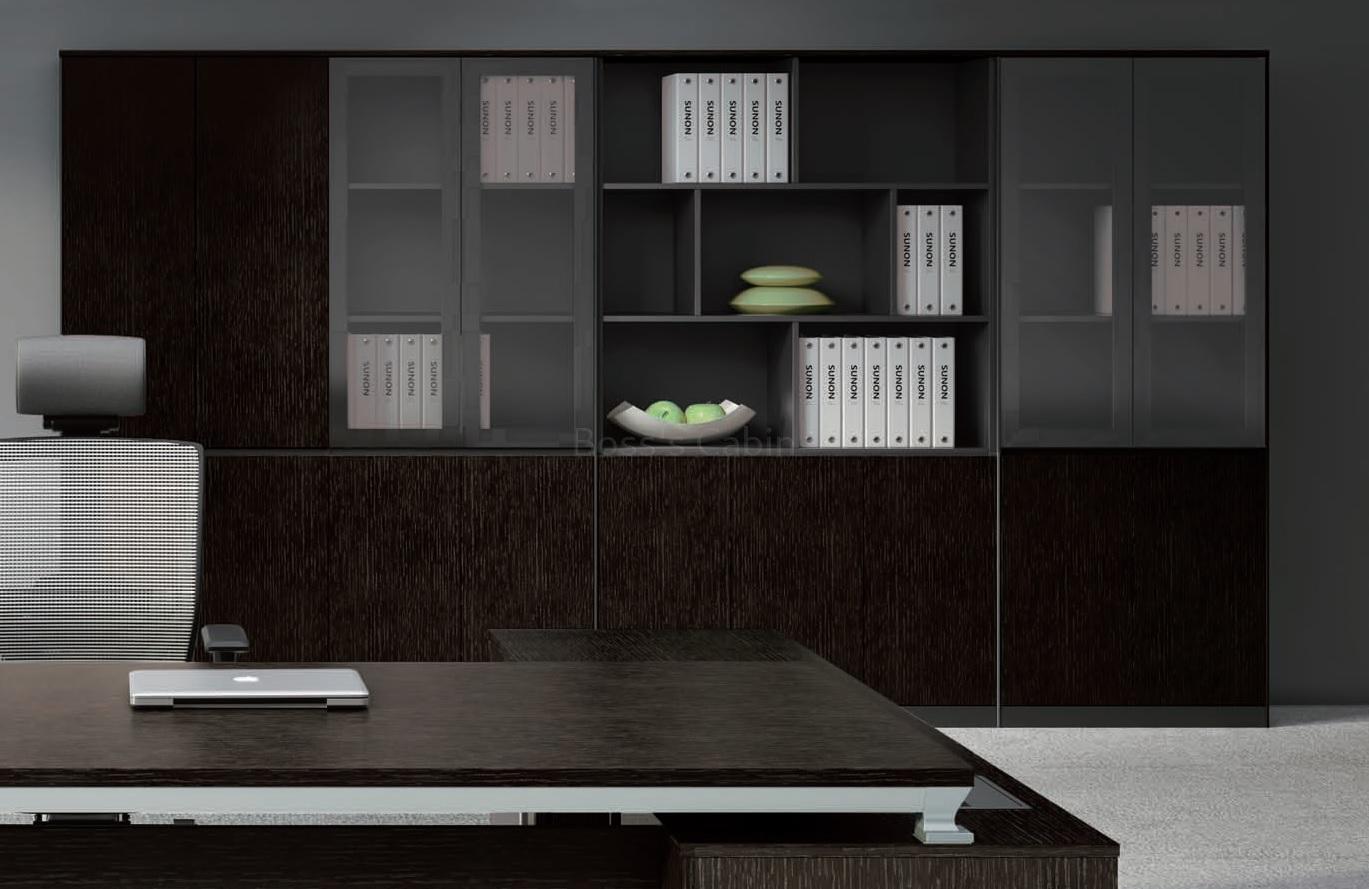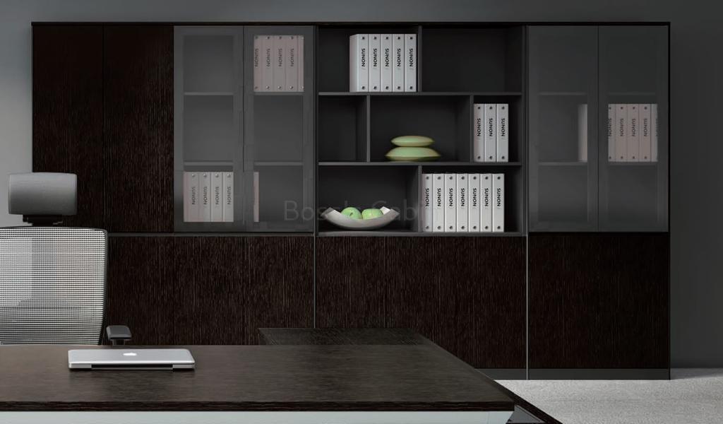 Crafted in rich wood veneer the contemporay Veneer series is a cabinet system that's designed to fit in any modern workspace and has an entire gamut of cabinets, credenzas in all shapes and sizes. Shown here is a wall cabinet with a combination of glass and wood doors with open space for display.