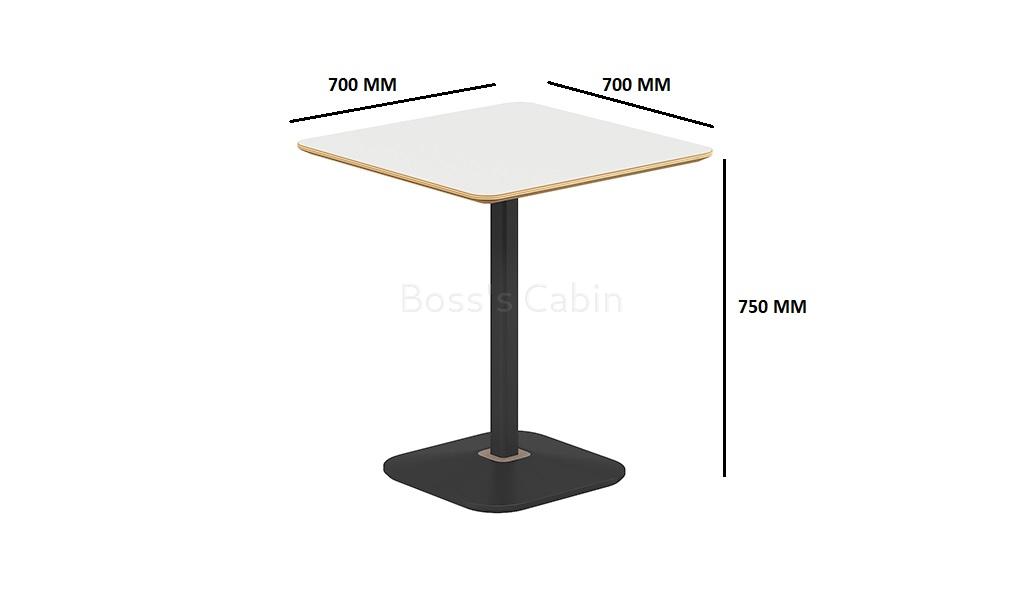 A modern cafeteria table in warm white laminate finish. 25 MM thick plywood tabletop with clear varnish edging and chamfered edges. Oil & acid/alkali resistant HPL coating on both sides of the table top. Spray painted steel legs with cast iron, pressure cast counter weight block base. An ideal choice for use in cafeterias, dining areas and restaurants.