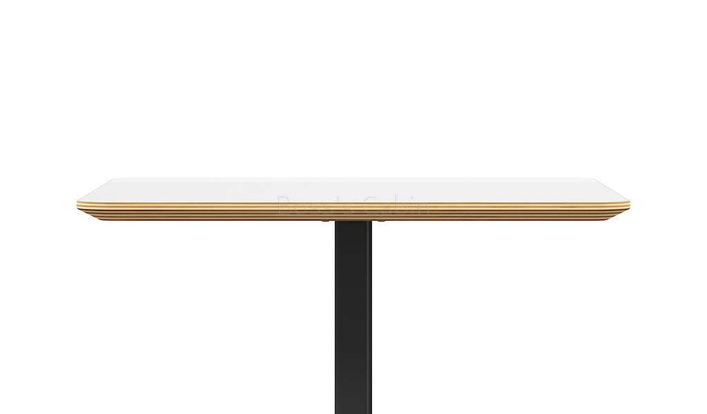 A modern cafeteria table with warm white laminate tabletop and cear varnish chamfered edging. White steel legs in lacquer spray paint finish & cast iron counterweight base. Suitable for cafeterias, restaurants, break-out and dining areas the tabletop is coated with oil and acid/alkali resistant HPL on both sides.