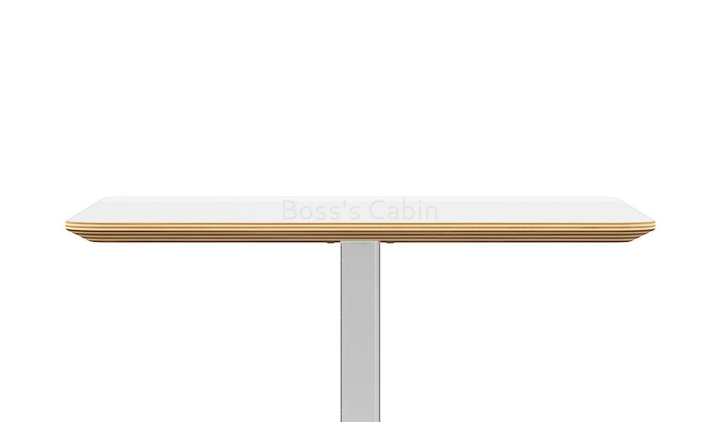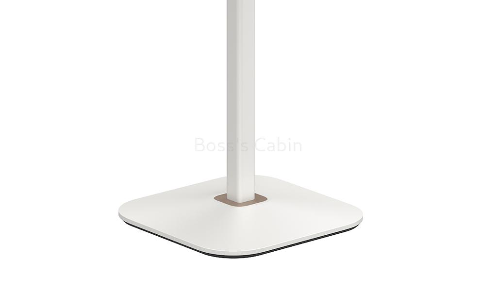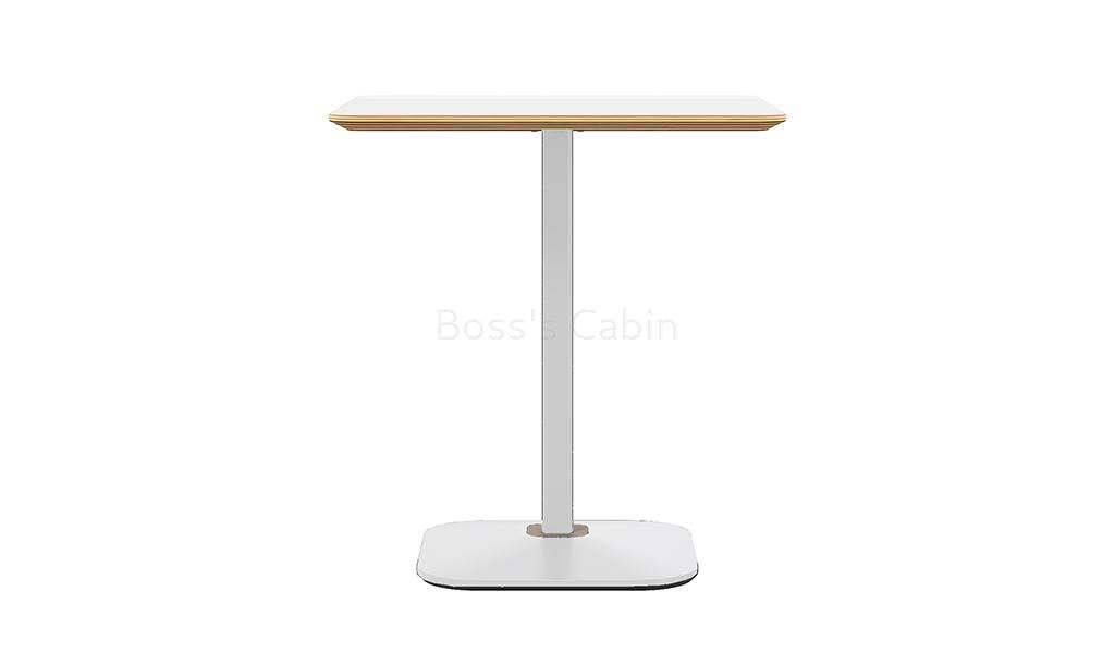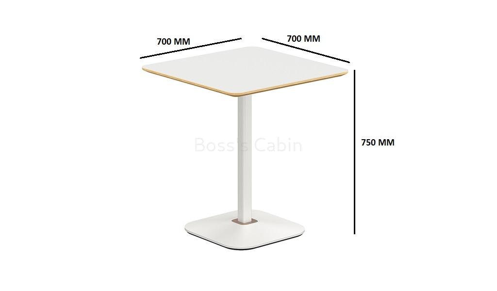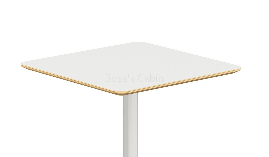 A modern cafeteria table in warm white laminate finish. 25 MM thick plywood tabletop with clear varnish edging and chamfered edges. Oil & acid/alkali resistant HPL coating on both sides of the table top. Spray painted steel legs with cast iron, pressure cast counter weight block base. An ideal choice for use in cafeterias, dining areas and restaurants.