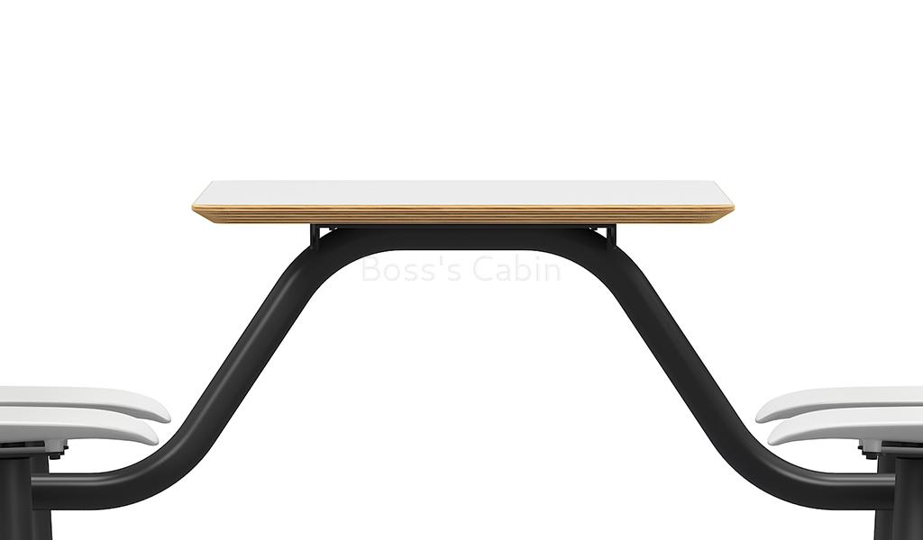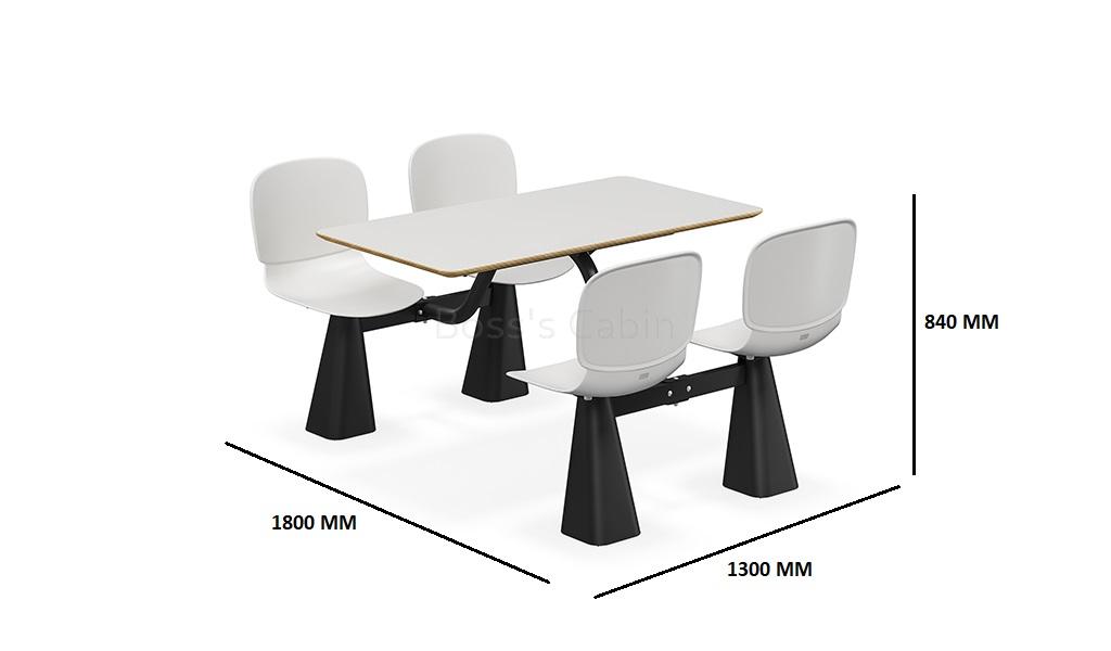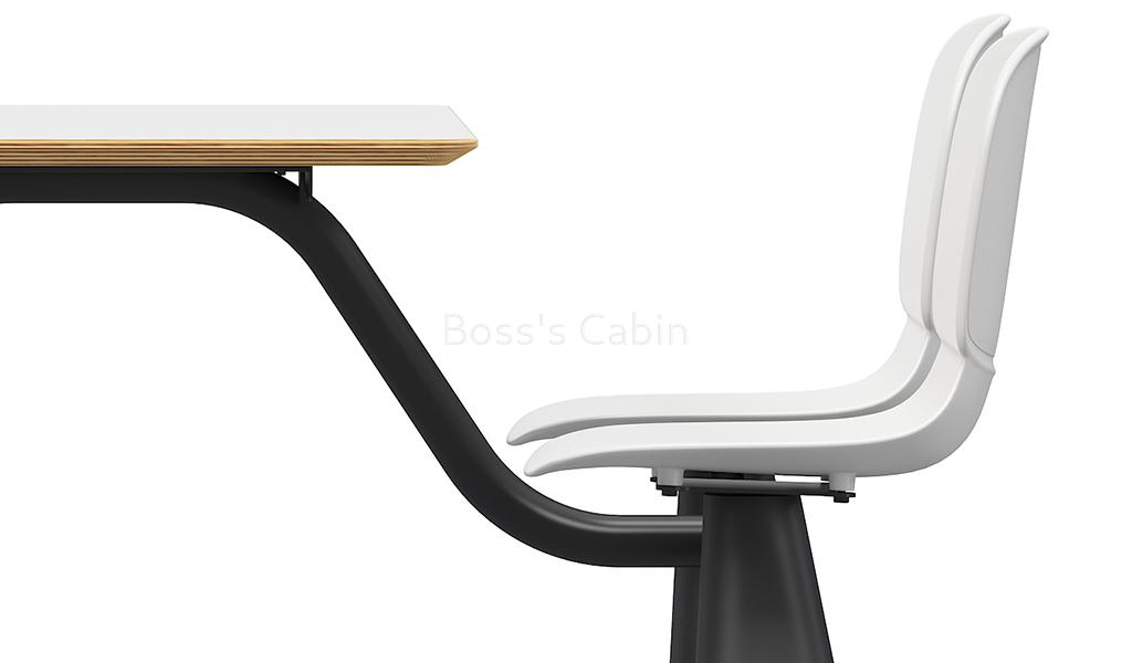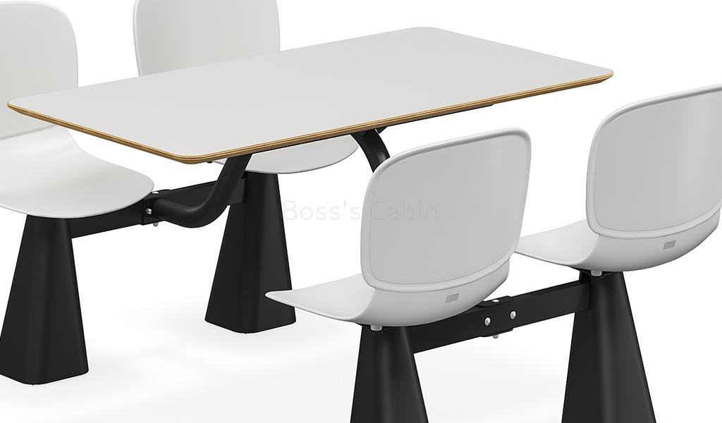 A cafeteria table and chair set designed as one tabletop with four PP glass fibre chairs mounted on heavy duty steel pedestals. 25 MM plywood tabletop with clear varnish edging, warm white laminate top coated with oil & acid/alkali resistant HPL. and heavy duty steel base and cross beams with black PP plastic shield. A perfect choice for factories, large offices with dining areas & cafeterias.