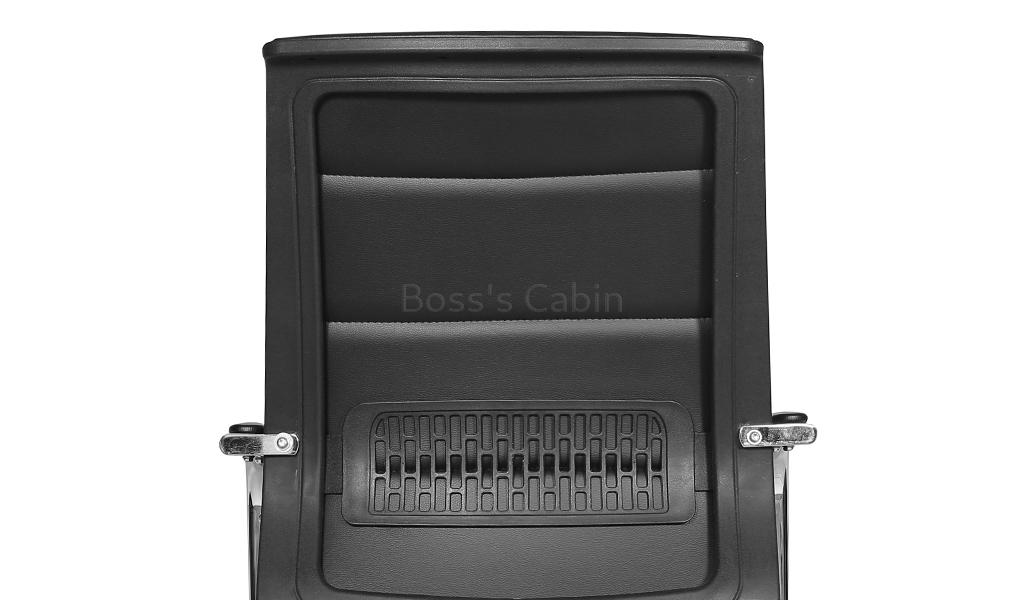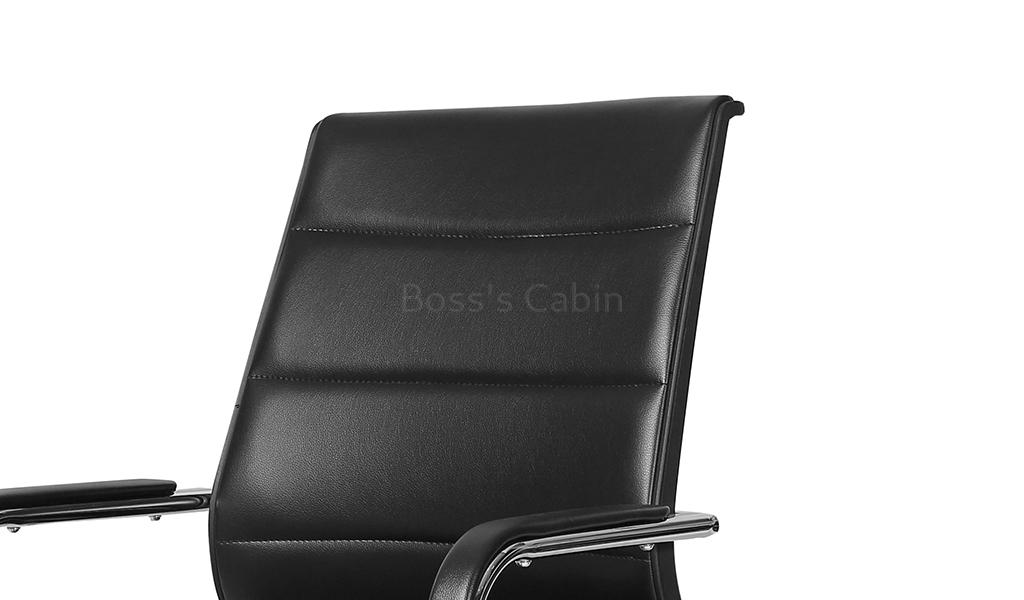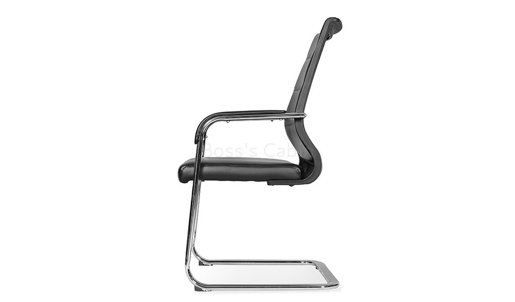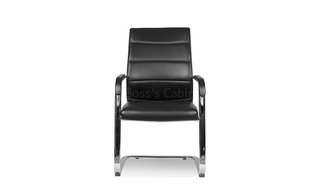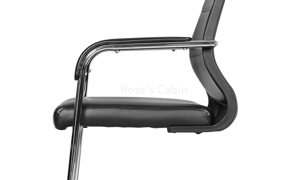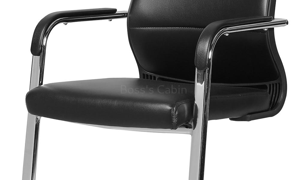 A medium back fixed base visitor chair in black artificial leather upholstery. Recommended for intensive use 6 to 8 hours per day. Medium back visitor's chair with fixed base. Soft artificial leather upholstery with high density foam. Ergonomically designed curved backrest. Soft nylon armrests with padding for maximum comfort. Heavy duty sled base in chromed steel. Lumbar support feature. Provided firm support to your lower back and fits the natural curve of your spine.
