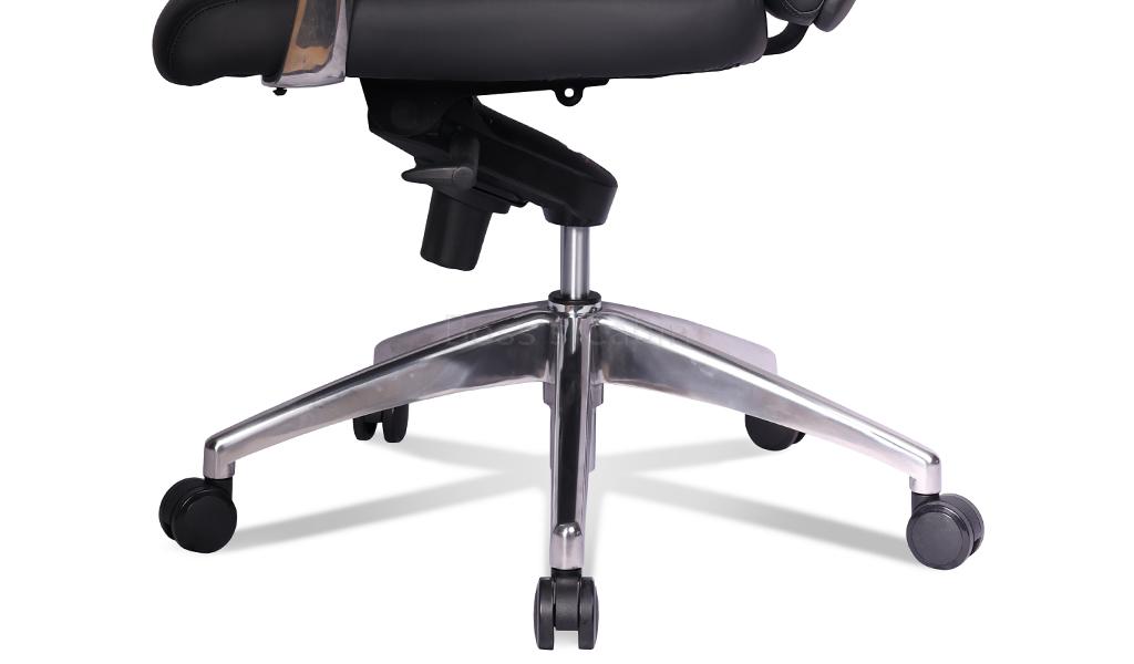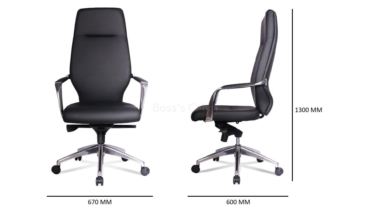 A premium, high back office chair in PU leather with aluminum alloy armrests & base. High back multi-function office chair in black PU leather. Standard knee tilt mechanism with tilt tension control. Polished aluminum alloy armrests with padding for maximum comfort. Pneumatic one touch seat height adjustment with class III gas lift. Heavy duty  polished aluminum base with nylon castors for easy mobility and lasting durability.