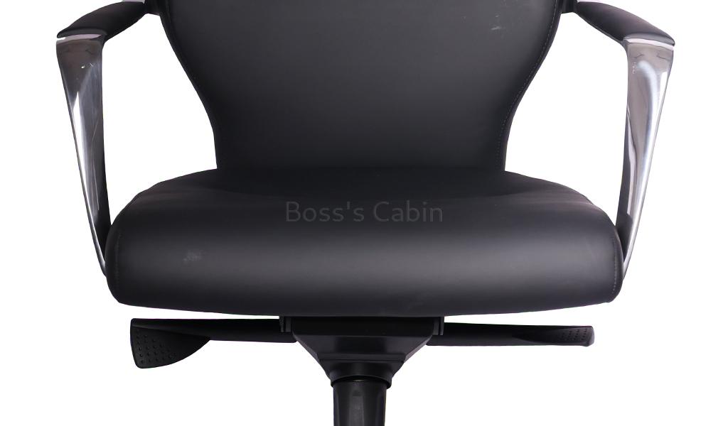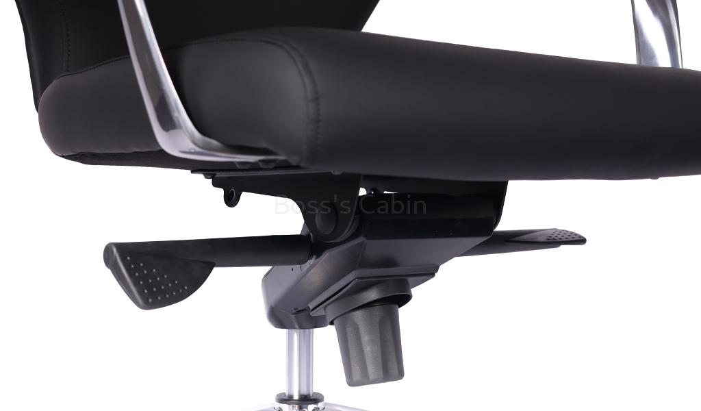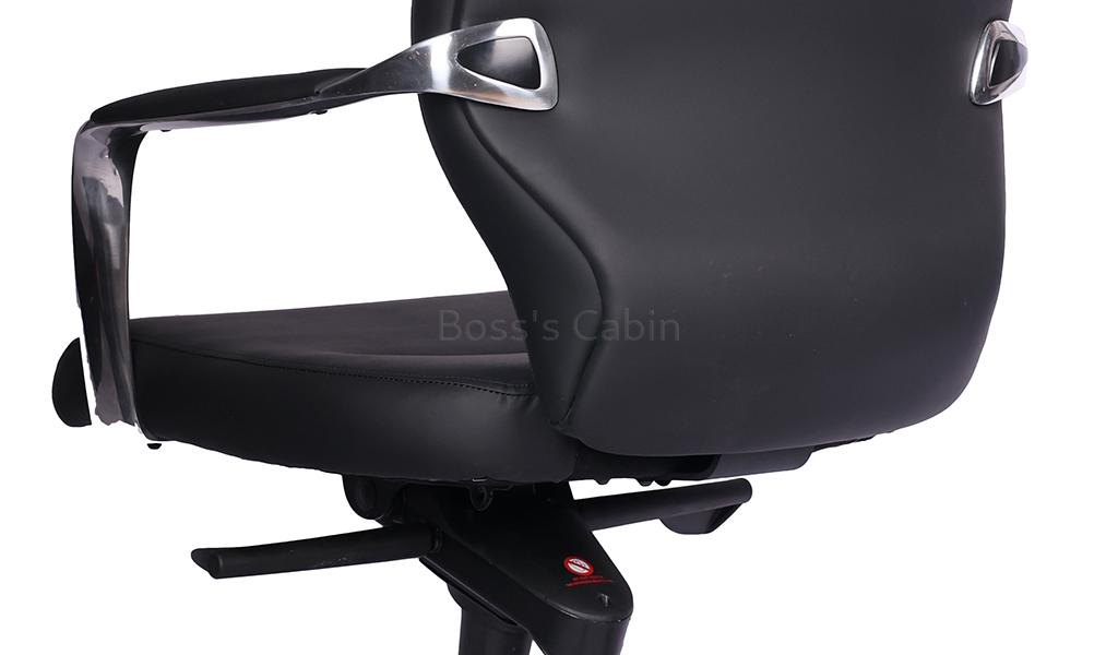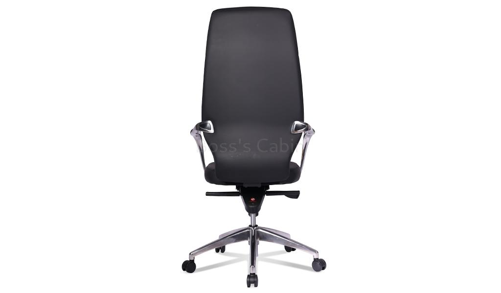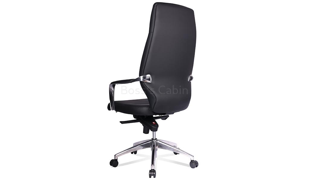 A high back office chair in artificial leather. Upholstered in PU black leather this generously proportioned chair has VFF polished aluminum alloy armrests with leather clad padding. Standard knee tilt mechanism, tilt tension control and aluminum alloy base with reinforced nylon casters. Ideal choice for office cabins and meeting rooms.