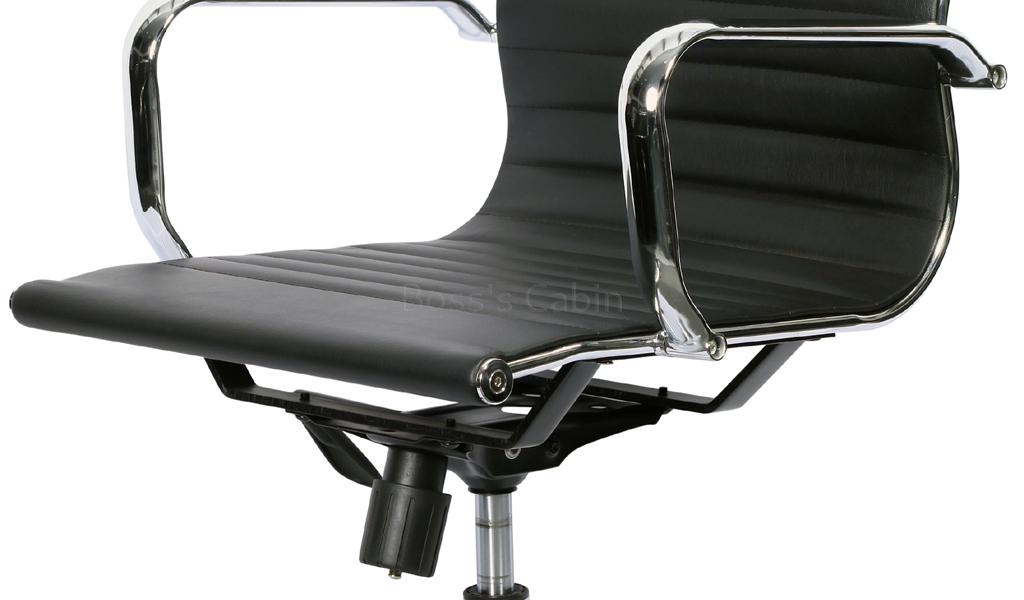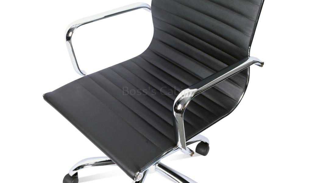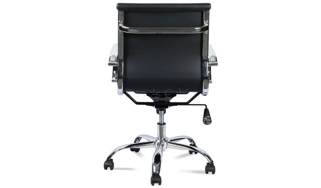 Inspired by the iconic Eams office chair designed by Sir Charles and Ray Eams this medium back chair has a timeless and enduring appeal. The stitched PU leather cover is simply attached to the profile sections and stretched over the steel frame giving the user a snug fit. Features tilt mechanism and tension control and pneumatic height adjustment with five star steel base and castors.