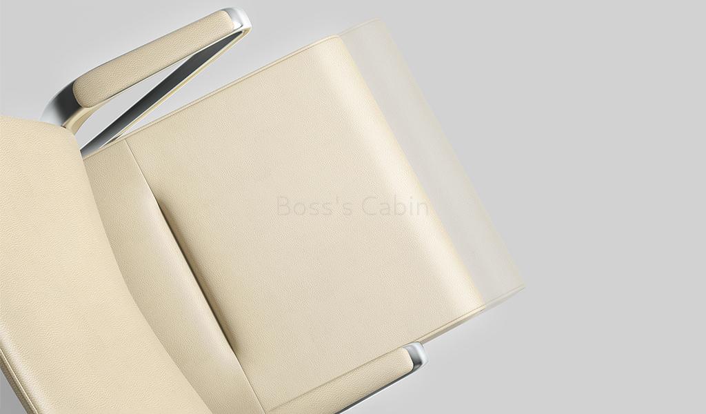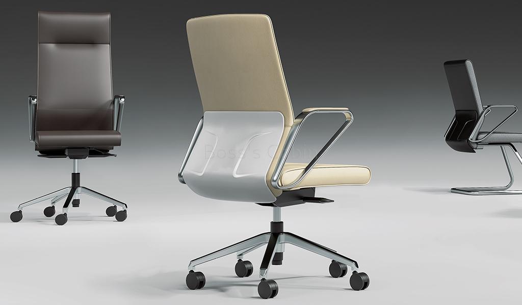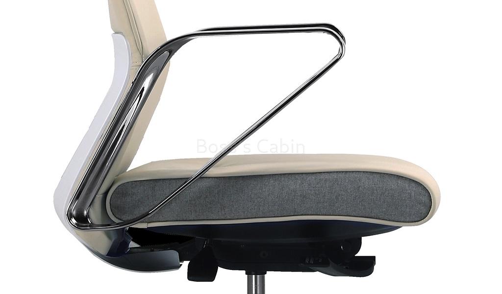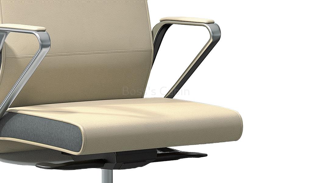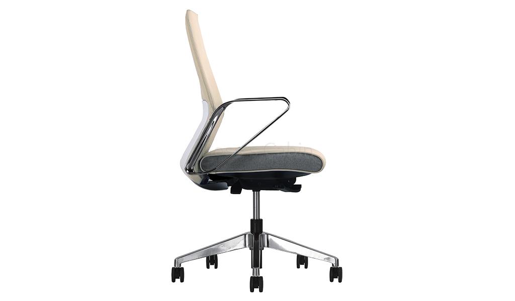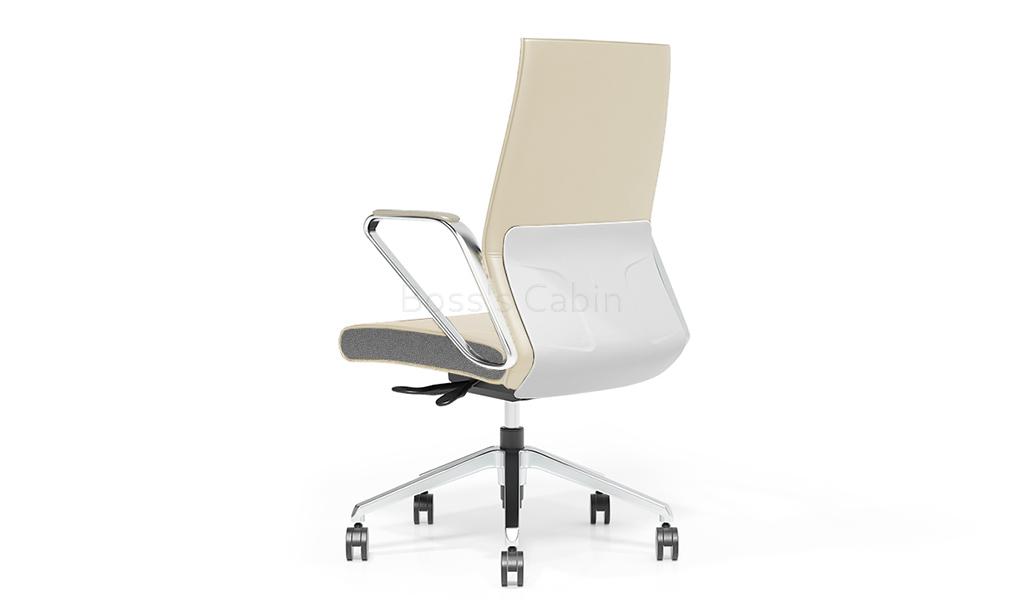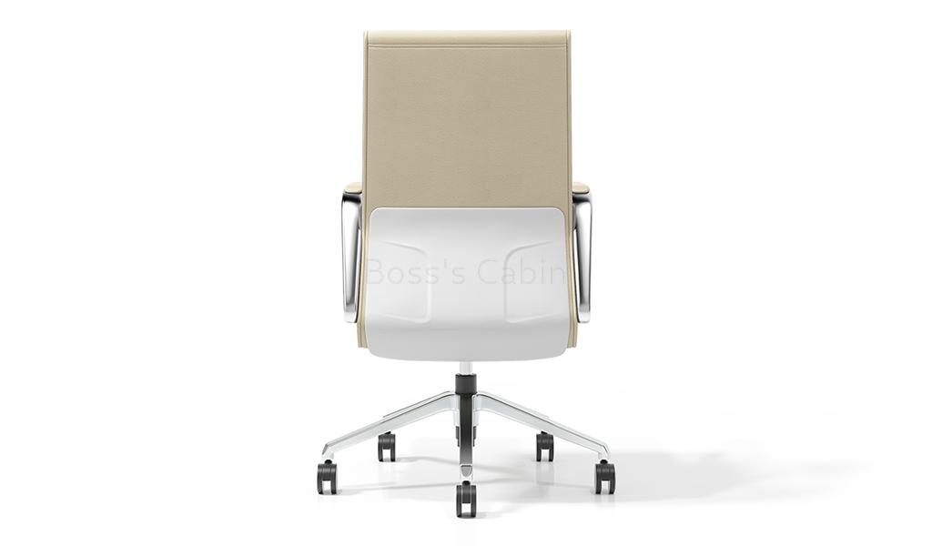 A feature packed medium back chair made with fine leather and state of the art engineering and ergonomics. Rich leather upholstery, slim design, white back panel with adjustable lumbar support, polished aluminum alloy armrests, synchronized tilt mechanism, multi-position locking, height adjustment, polished aluminum base and nylon castors.