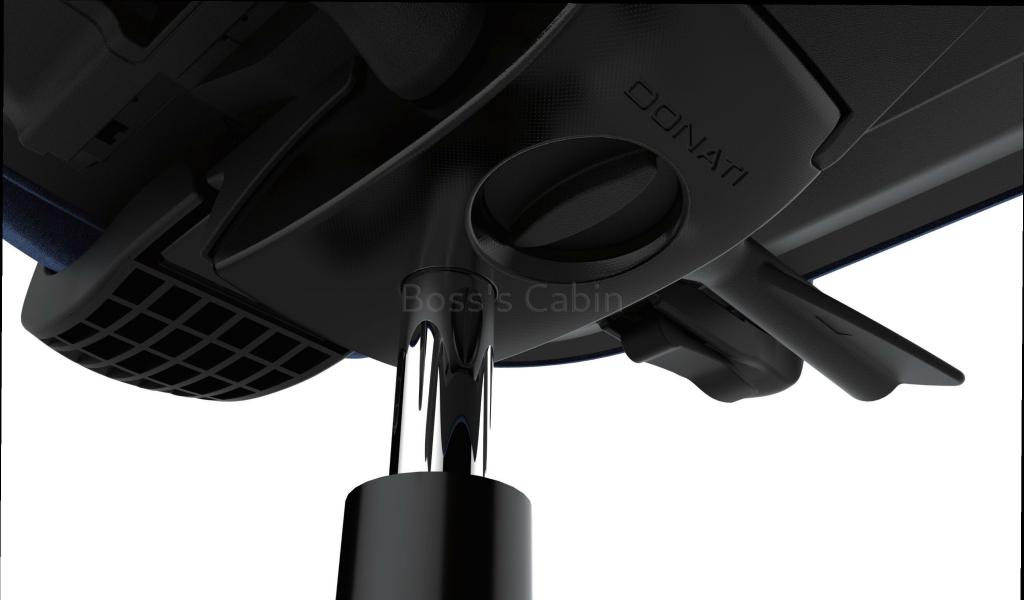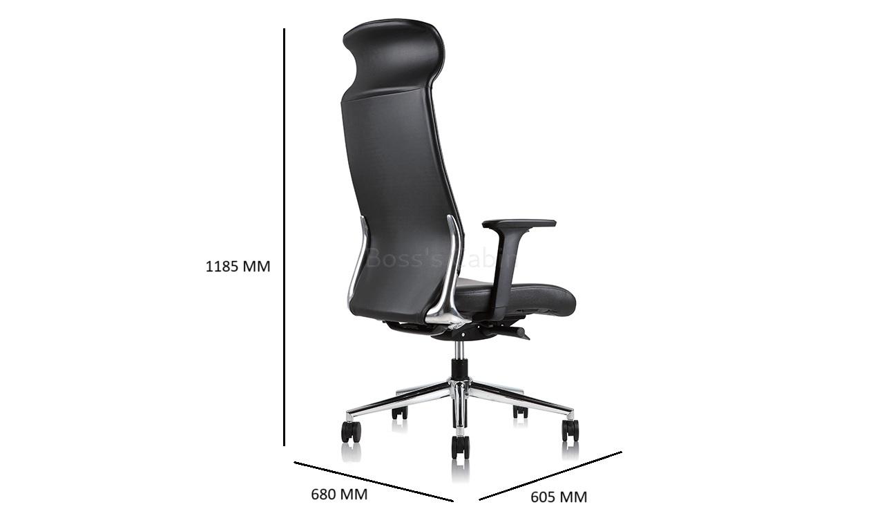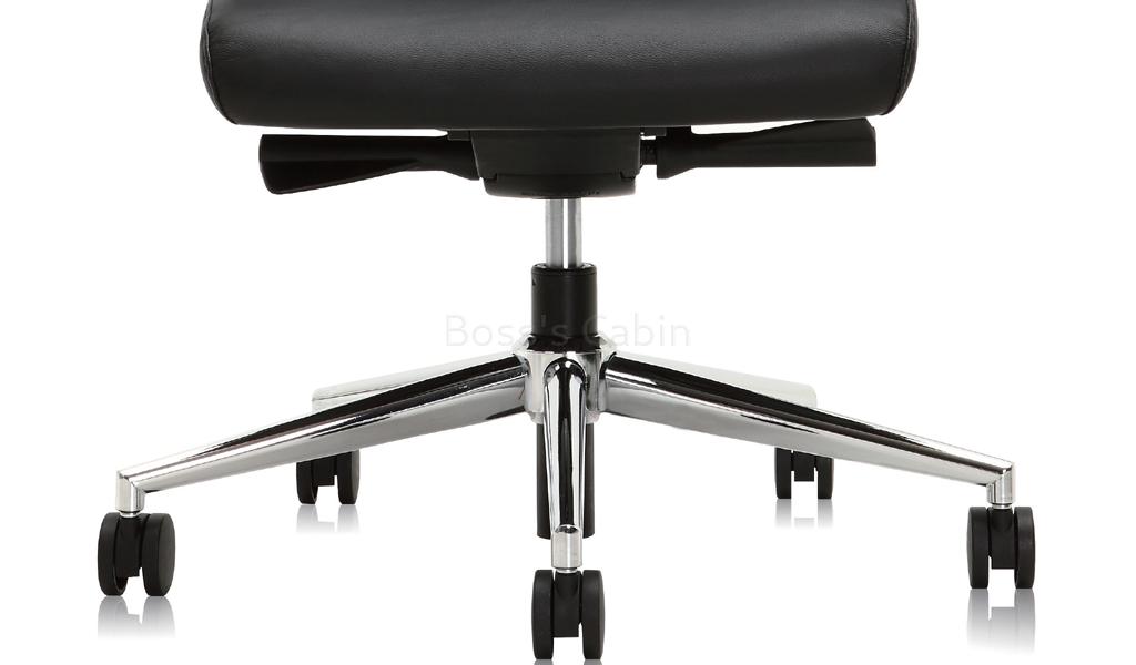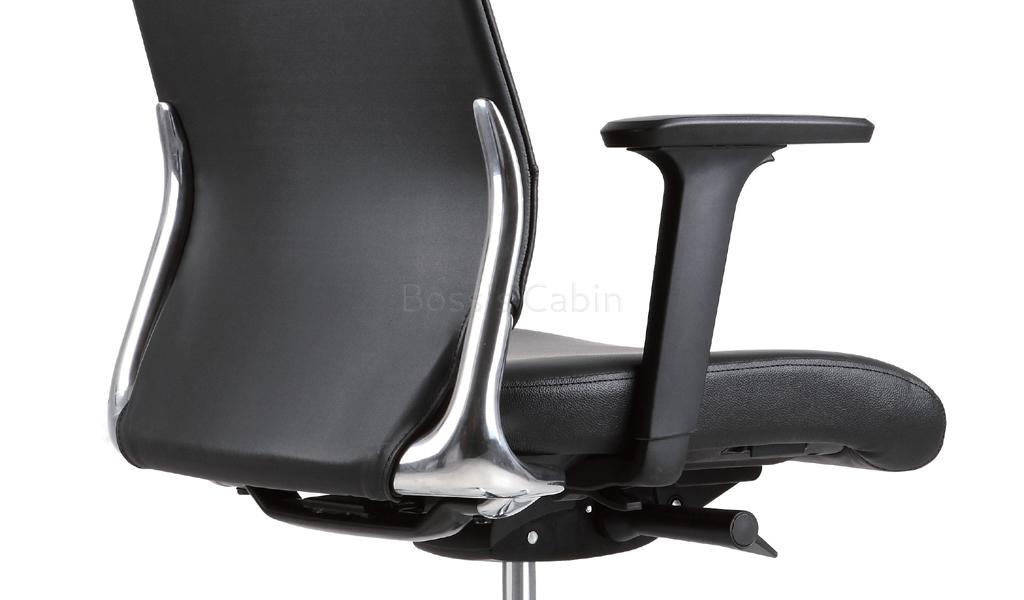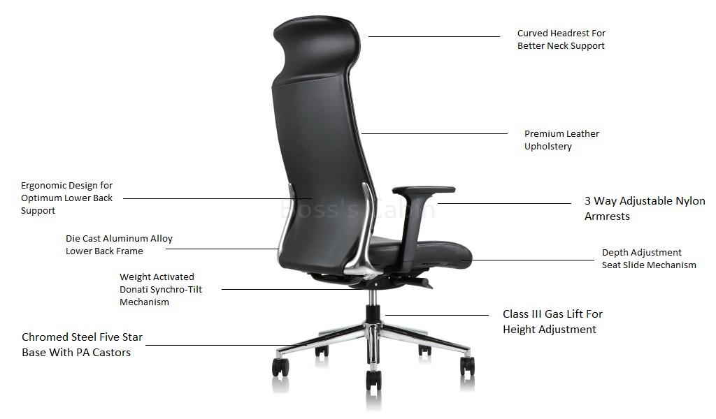 A premium high back office chair in black color genuine leather upholstery. Includes advanced ergonomic features recommended for intensive use of 6 to 8 hours per day. Easy to operate, high back, multi-function executive chair Genuine leather upholstery and high density PU foam cushioned seat. Lumbar support feature. Supports your lower back and natural curve of your spine. Donati synchronized tilt and weight sensitive tension control mechanism. Synchro tilt helps keep proper balance between your torso and legs so that neither has too much pressure when you sit for extended periods. Multi-position locking. Padded armrests with three way adjustment for maximum comfort. Pneumatic one touch seat height adjustment Heavy duty polished steel base with nylon castors for easy mobility and lasting durability.