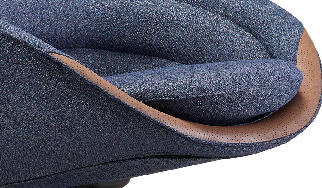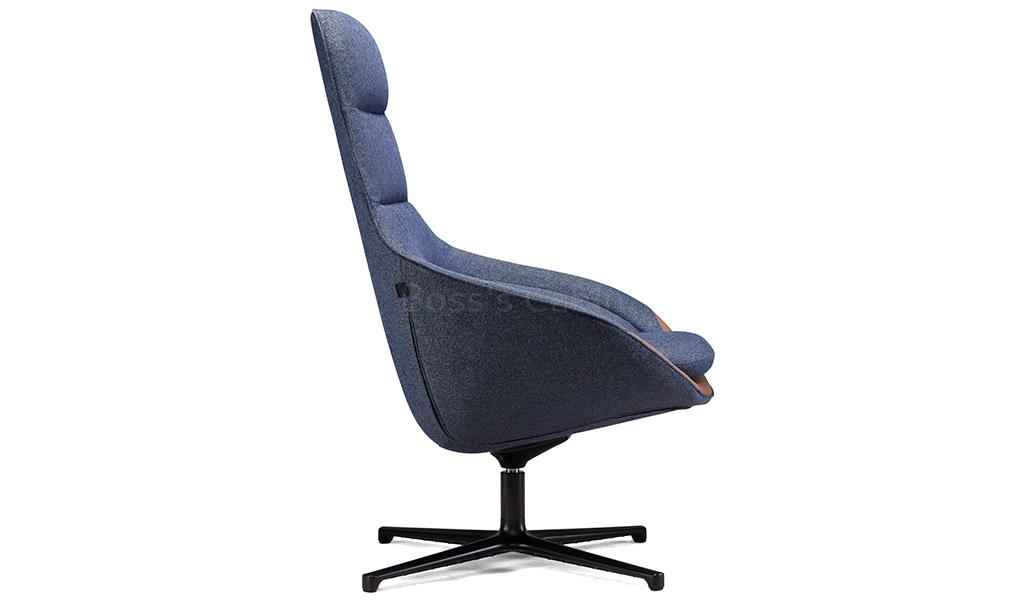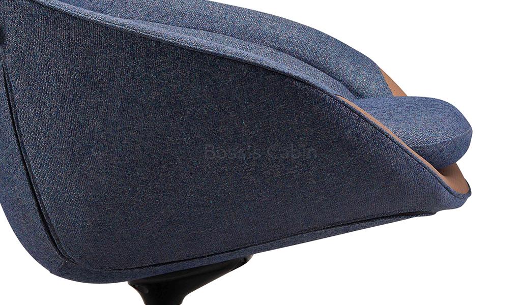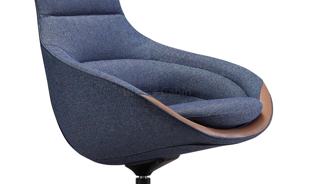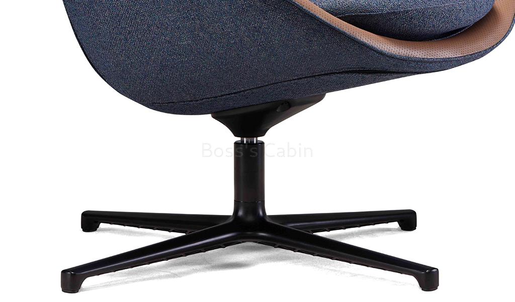 A multi-purpose lounge chair in blue textured upholstery fabric that can fit into different areas of an office whether its the reception lounge, cafeteria, break out area or your office cabin. A stylish and comfortable chair with a high backrest, tan leather trim and black aluminum revolving base in a four star configuration.