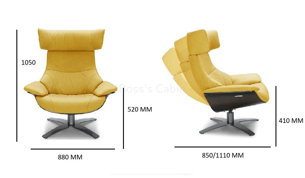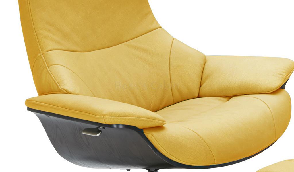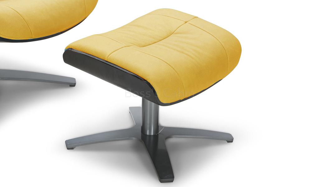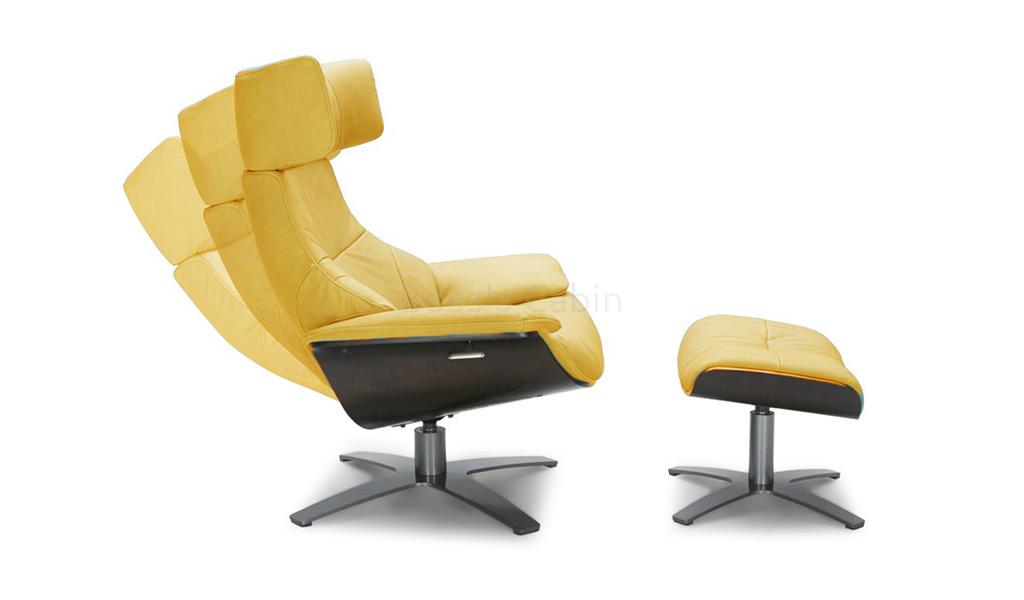 A luxurious lounge chair in rich mustard yellow leather and solid steel base in metallic gray finish. Karma is a series of luxurious and stylish lounge chairs & ottomans with premium leather upholstery. Includes multi-position locking and reclining mechanism, heavy duty matte gray metal base with swivel feature and a foot stool. Can be customized to different colors.