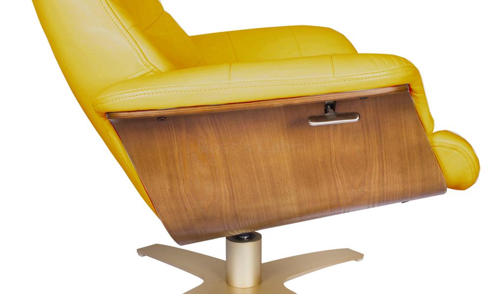 Yellow leather upholstered seat with walnut veneer seat shell. Heavy duty metal base in powder coated finish with reclining and revolving mechanism. Ottoman with matching leather upholstery and base.