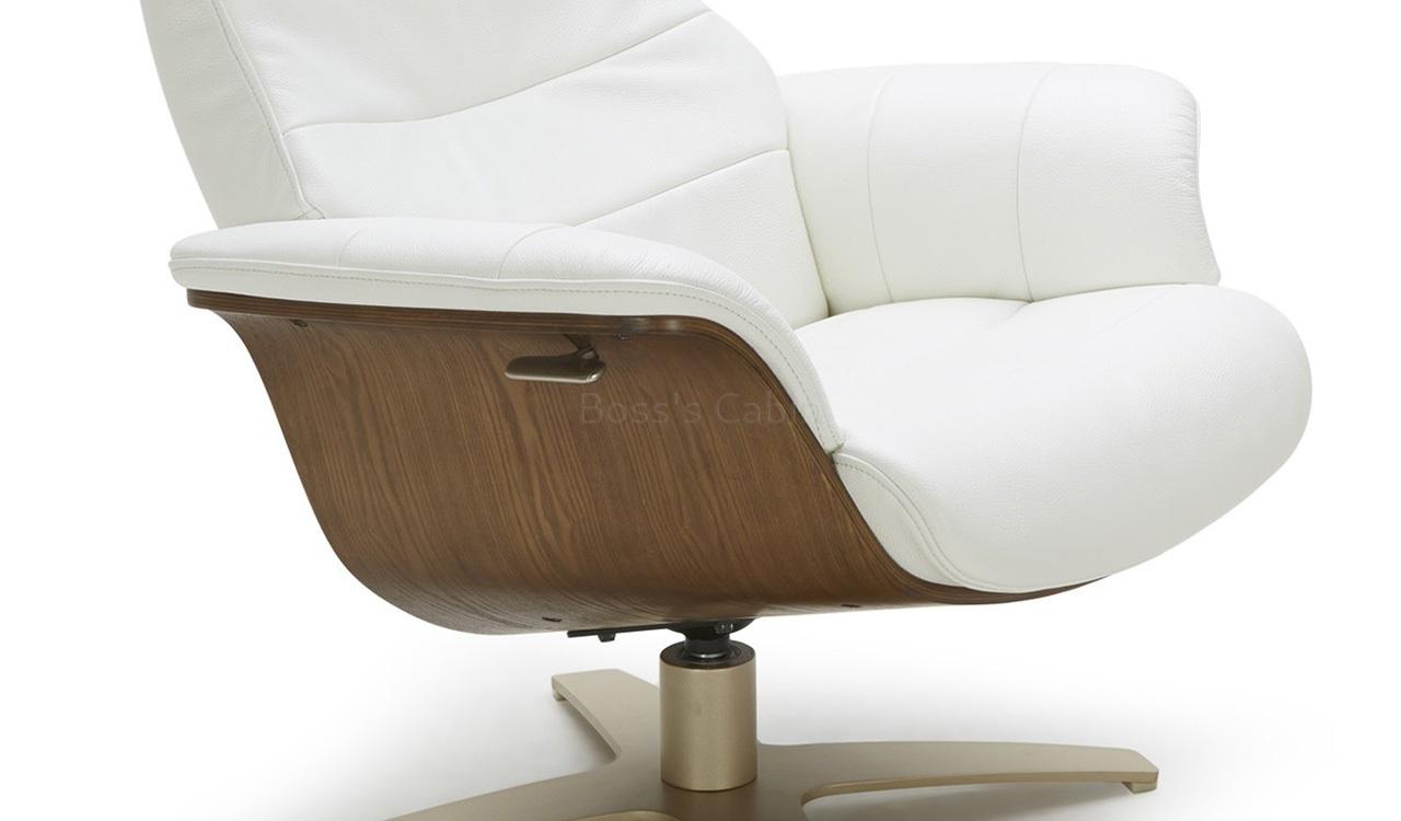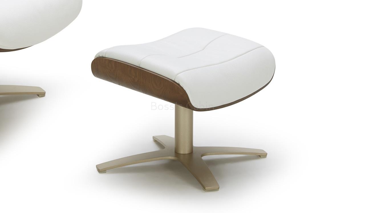 A luxurious and stylish reclining chair and ottoman in white genuine leather upholstery. Designed with a walnut veneered seat shell, a matte gold base with swivel and reclining mechanism having multi-position locking. You can use it as an accent chair in any area of your office cabin or lounge.
