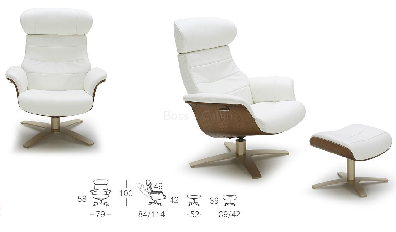 White leather upholstered seat with walnut veneer seat shell. Heavy duty metal base in powder coated finish with reclining and revolving mechanism. Ottoman with matching leather upholstery and base.